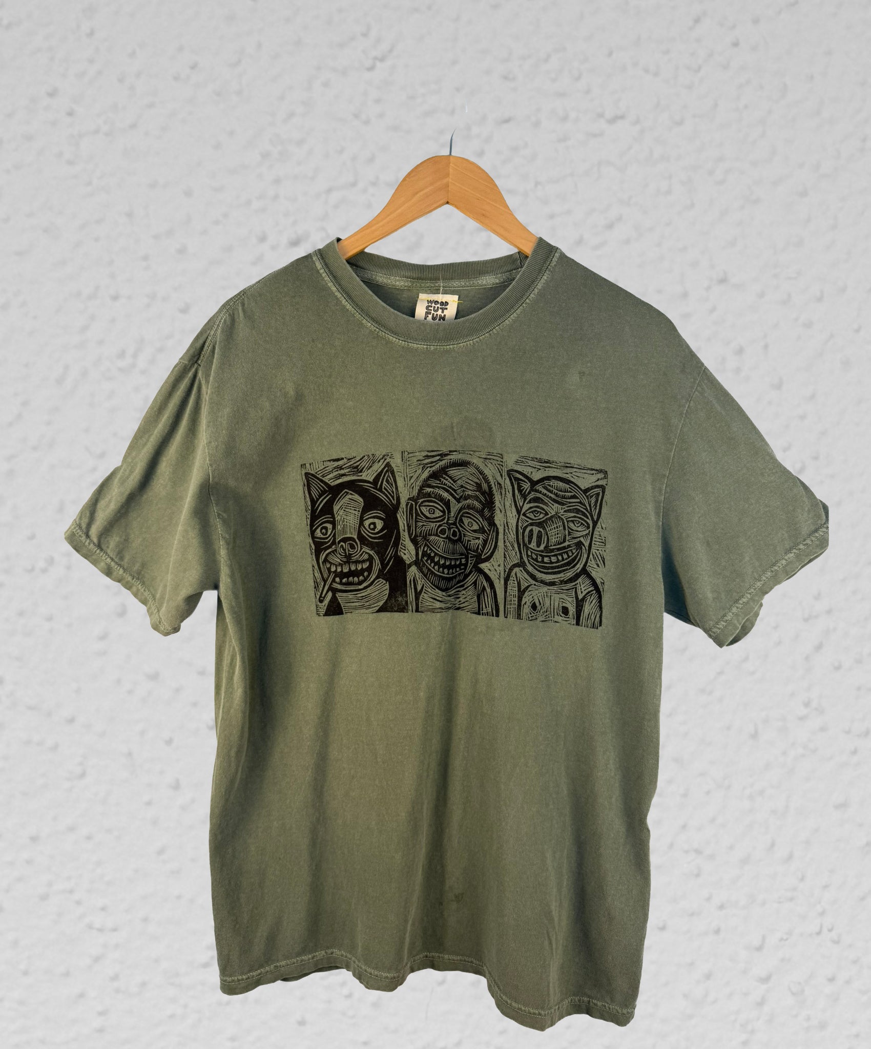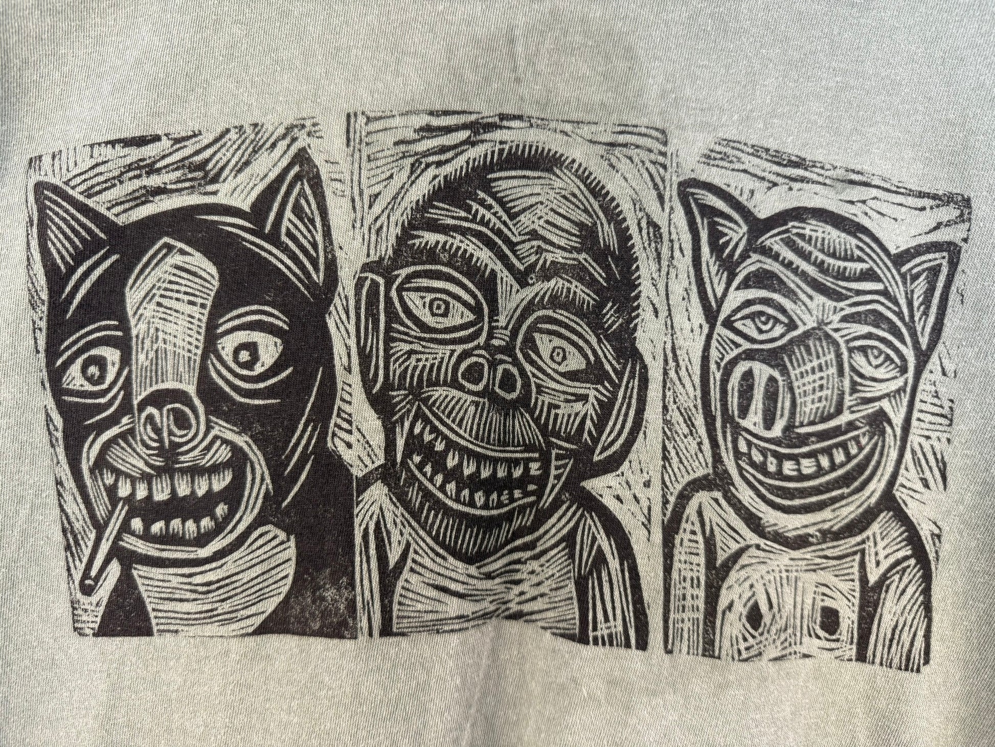This shirt features three of my favorite animal woodcuts (carved out of Japanese Shina woodblocks) printed together.