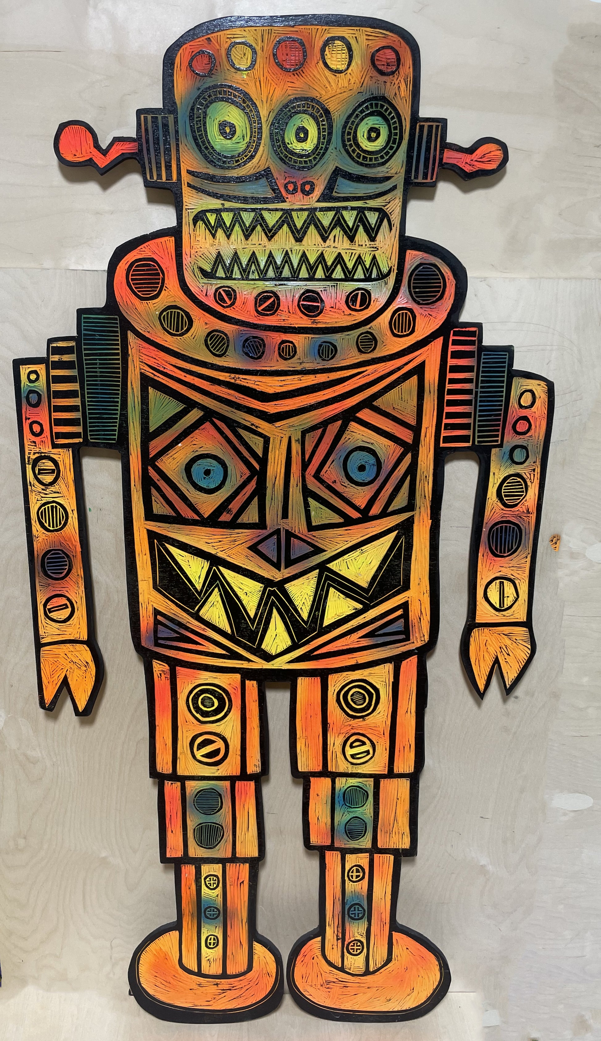 Intruder Alert !! Its all hand carved and shaped , painted and then black ink is rolled over the finished piece. These are a little more expensive than the prints and t-shirts I sell online, so you might have questions about it. Check out the video and the specs but if you have any questions please email me directly at woodcutfunhouse@gmail.com.