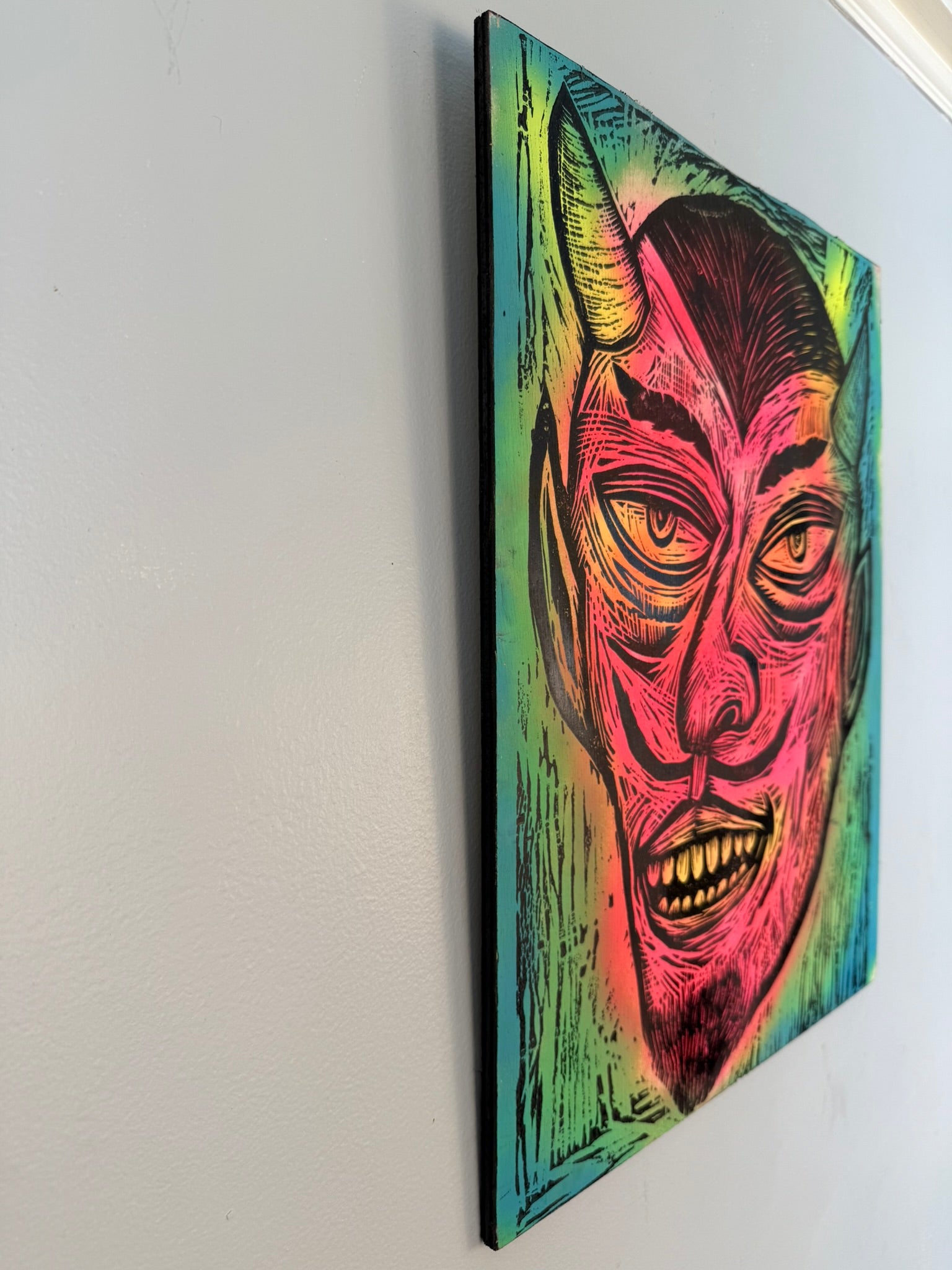Devil Head Woodcut Printed on Painted Wooden Panel