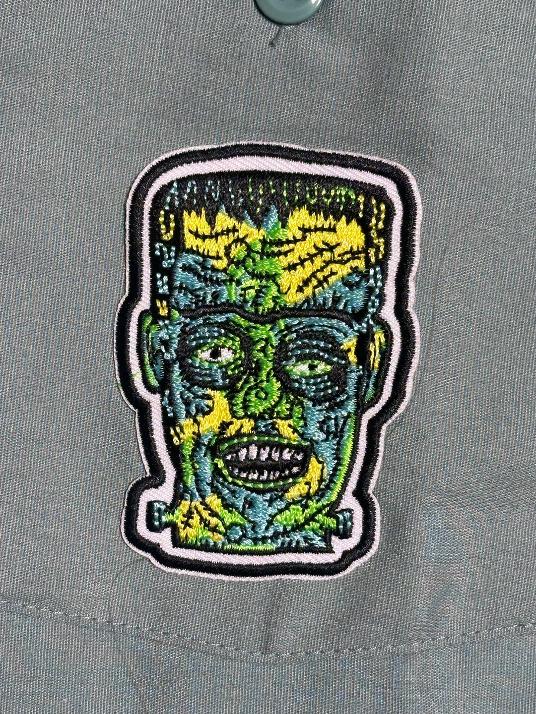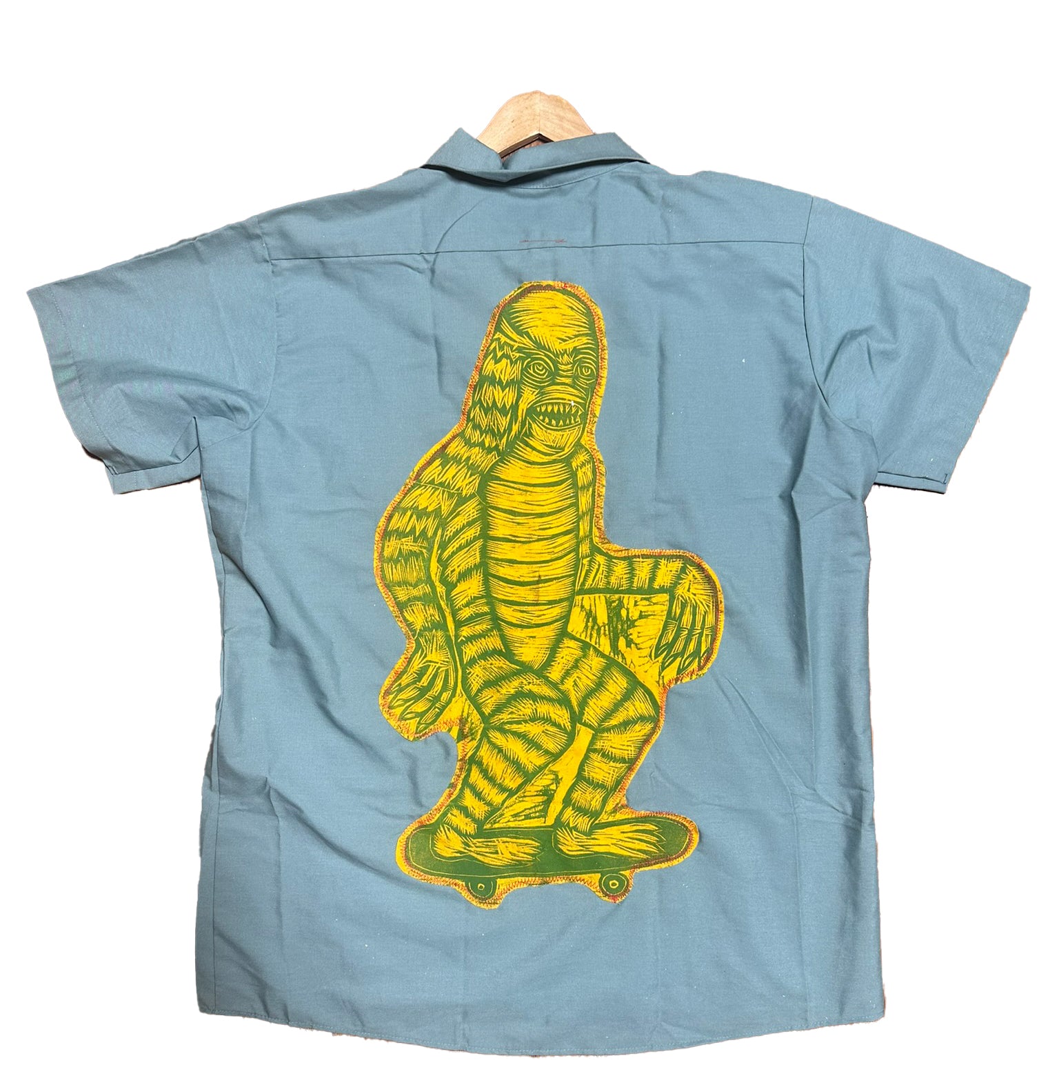 Dream Job Light Green Workshirt with Handprinted Woodcut Skate Creature Applique