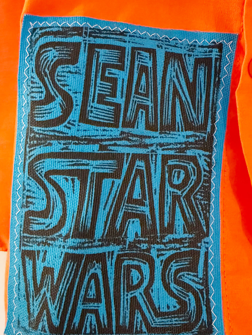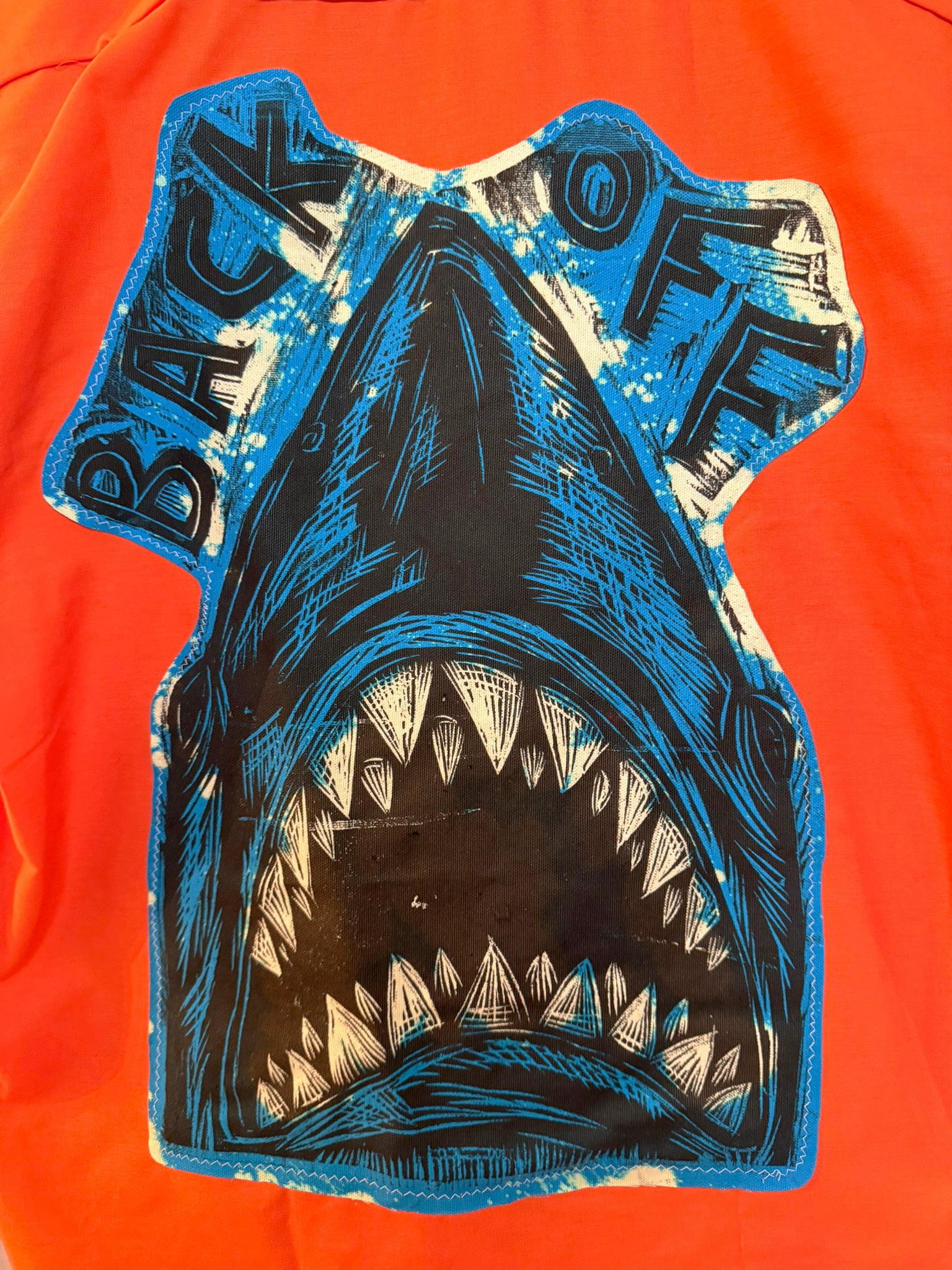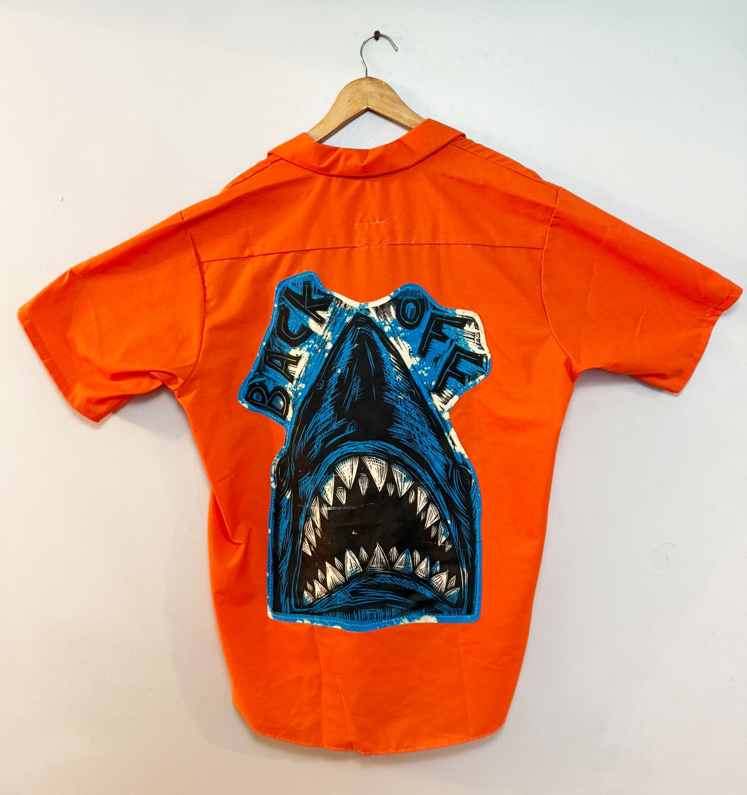 Dream Job Handprinted Workshirt Orange with Blue Shark Applique