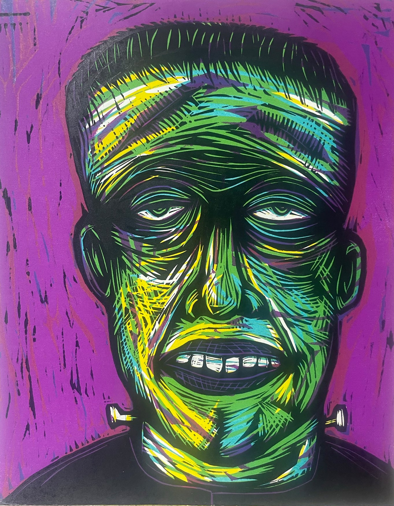 Frankenstein Kid Handprinted Multi Color Woodcut