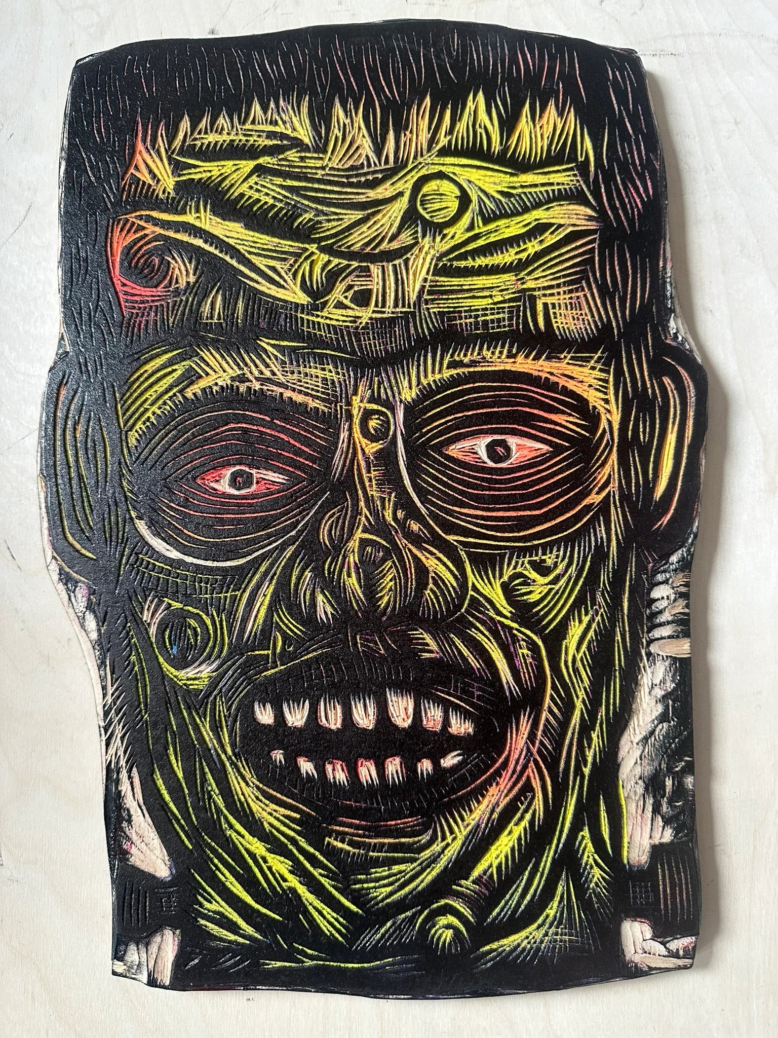 ⩙ My woodcuts are carved from Baltic Birch or Japanese Shina using an assortment of Japanese gouges printed on American-made presses, fueled by ice-cold Mountain Dew with Guided by Voices always playing loudly in the background!
