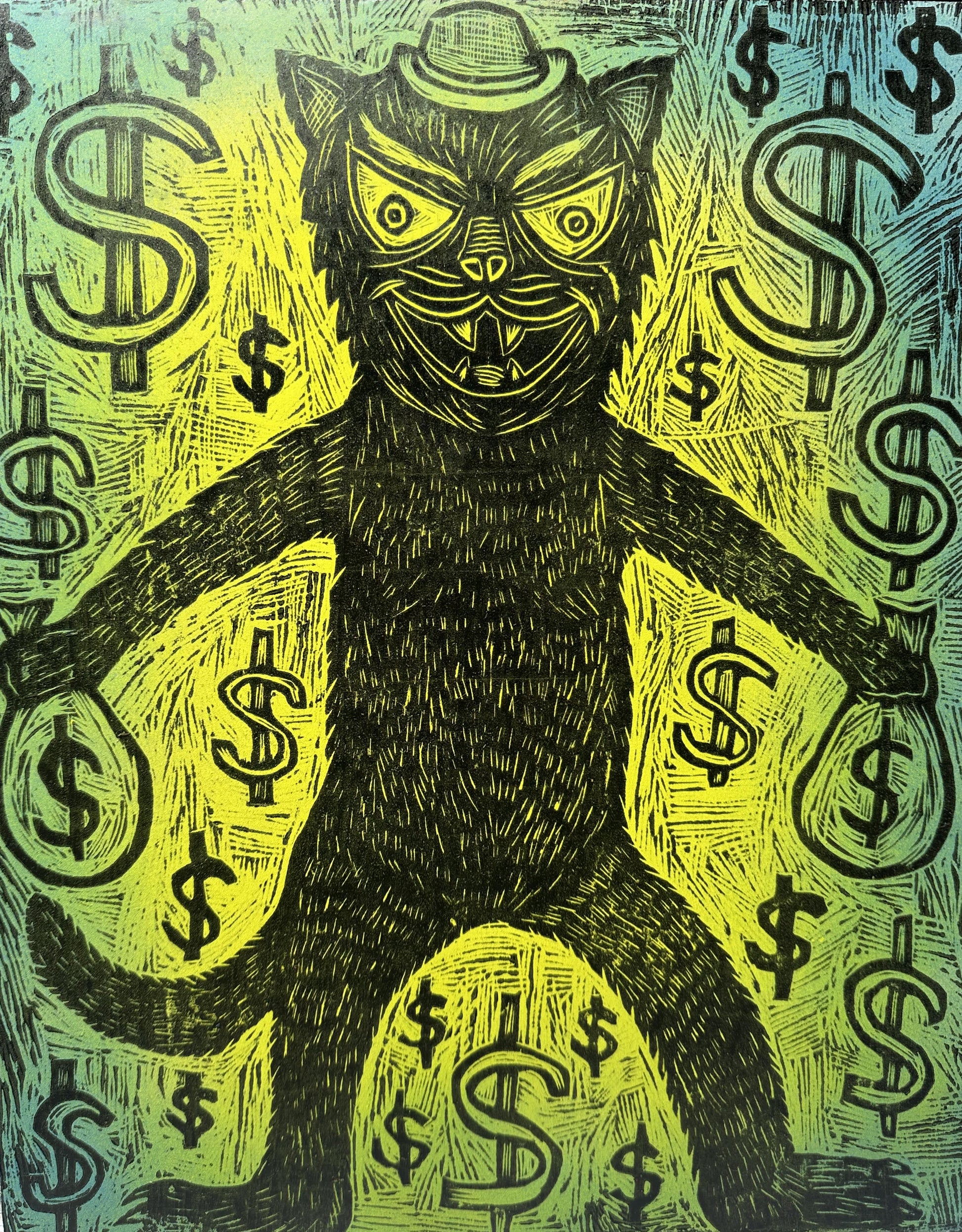 Green Aurora Money Cat Woodcut printed on a Wooden Panel