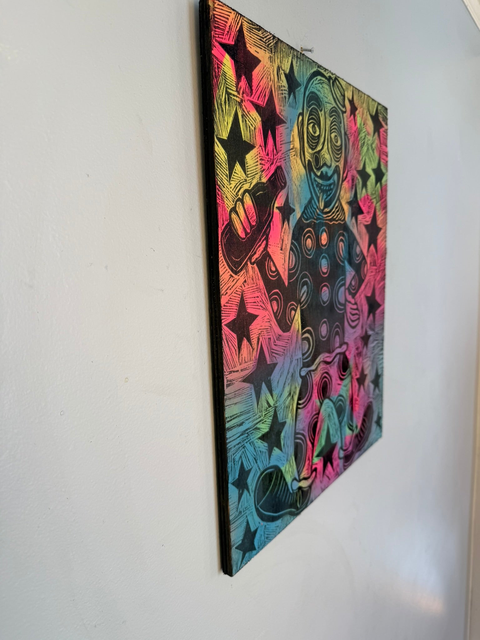 Cosmic Clown Woodcut printed on a Wooden Panel