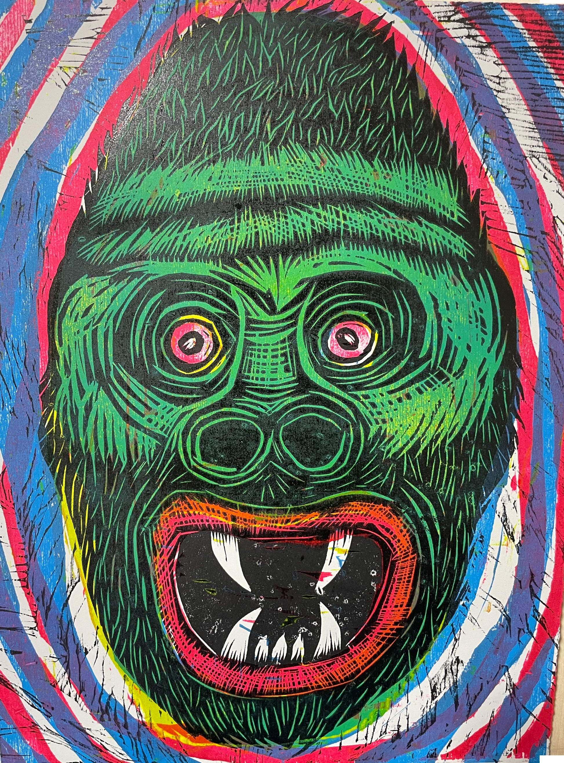 ⩙ My woodcuts are carved from Baltic Birch or Japanese Shina using an assortment of Japanese gouges printed on American-made presses, fueled by ice-cold Mountain Dew with Guided by Voices always playing loudly in the background!