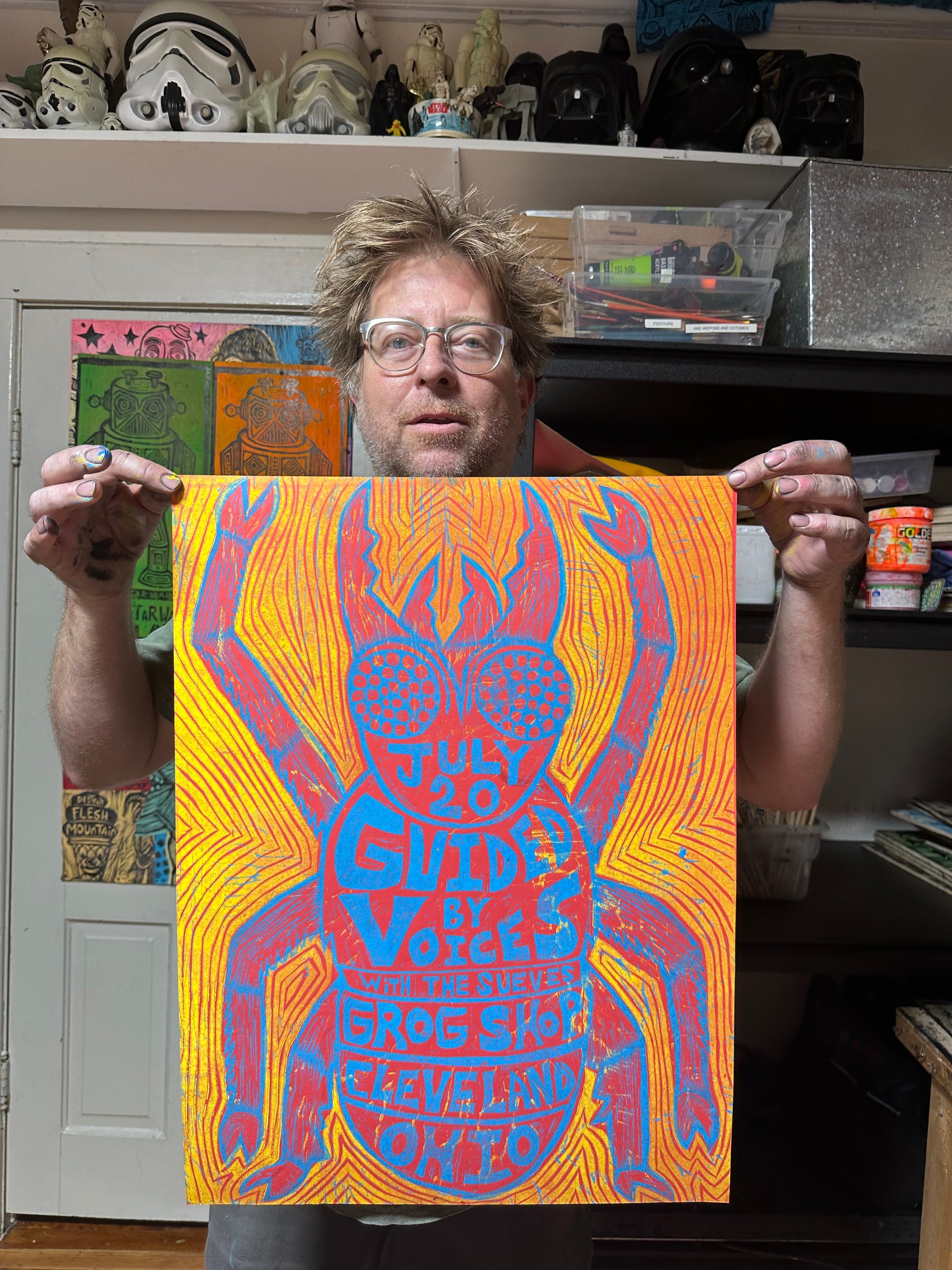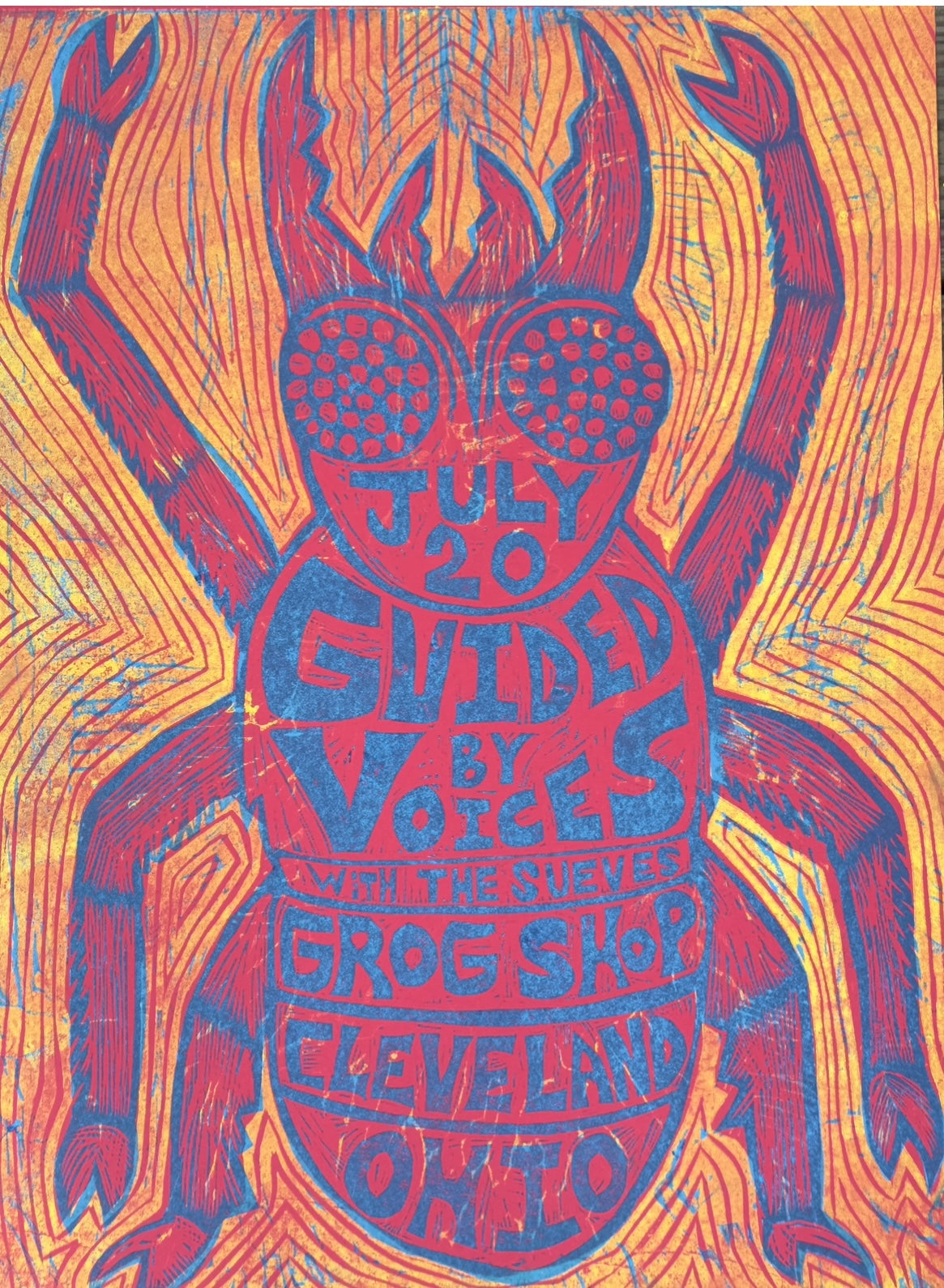 I've made a ton of gig posters for Guided By Voices .This is for the July 20 show at Grog Shop in Cleveland . They will be signed and dated by me. This is a two color block printed poster on red paper measuring 18" x 24" they are $40.