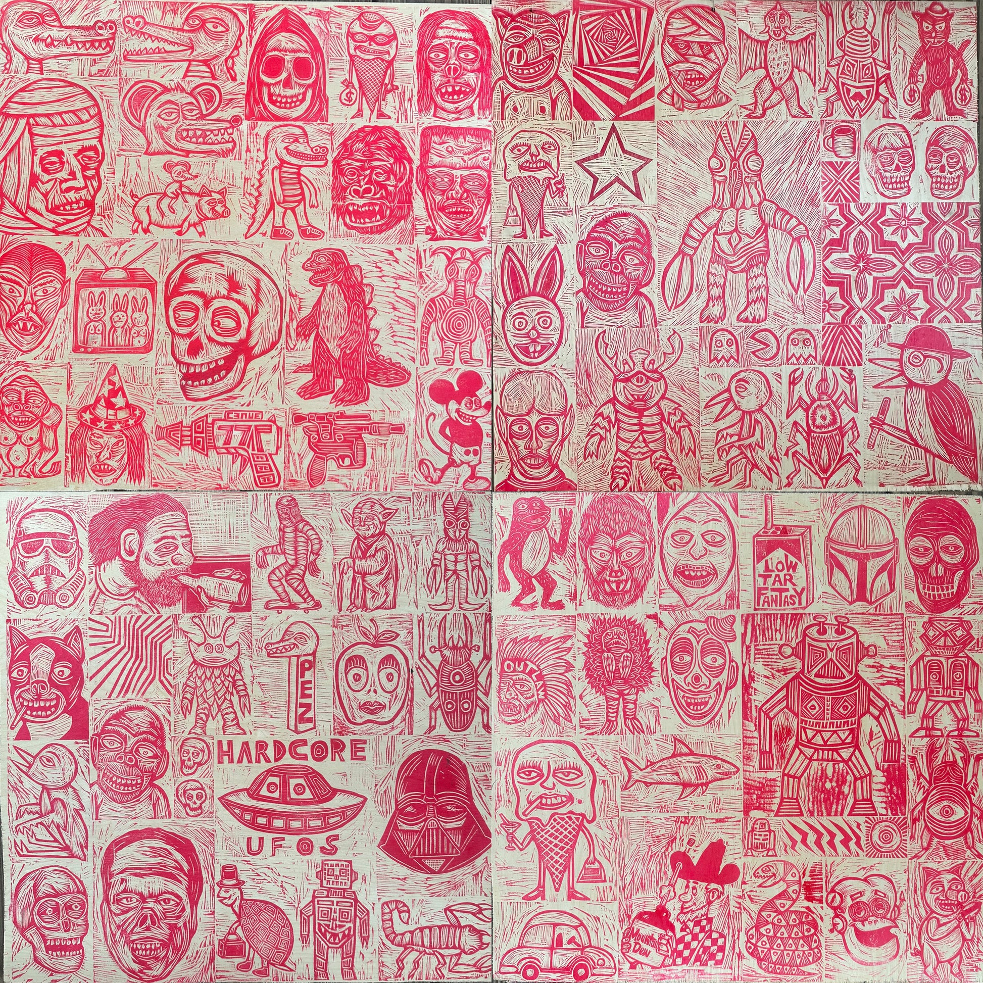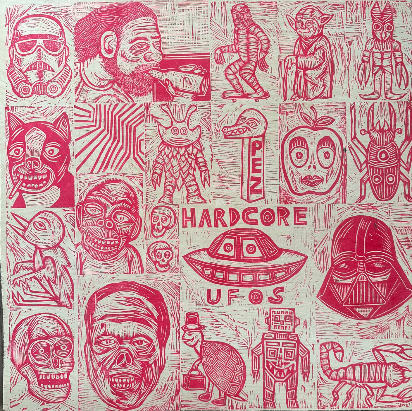 Hardcore UFOS Woodcuts printed on Painted Wooden Panel