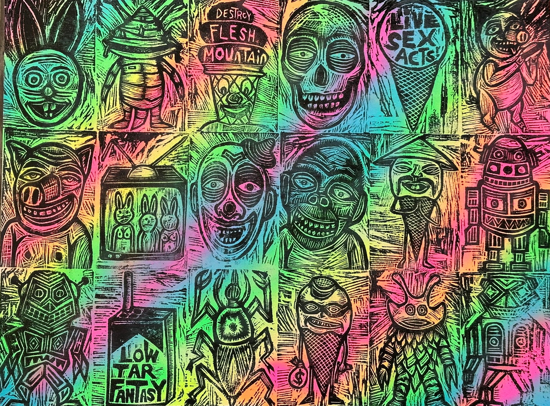 Idol Time Woodcuts printed on a Wooden Panel