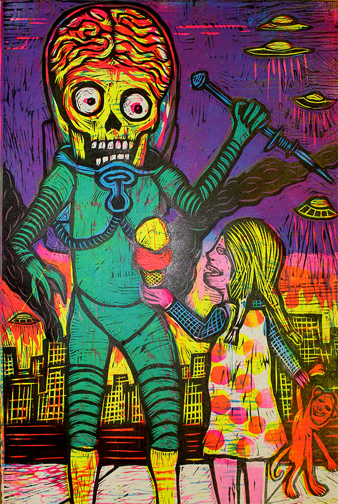 Everybody loves Mars Attacks right? Like many people, I didn't know that the movie was based on an old set of trading cards. This woodcut was based on one of the cards...