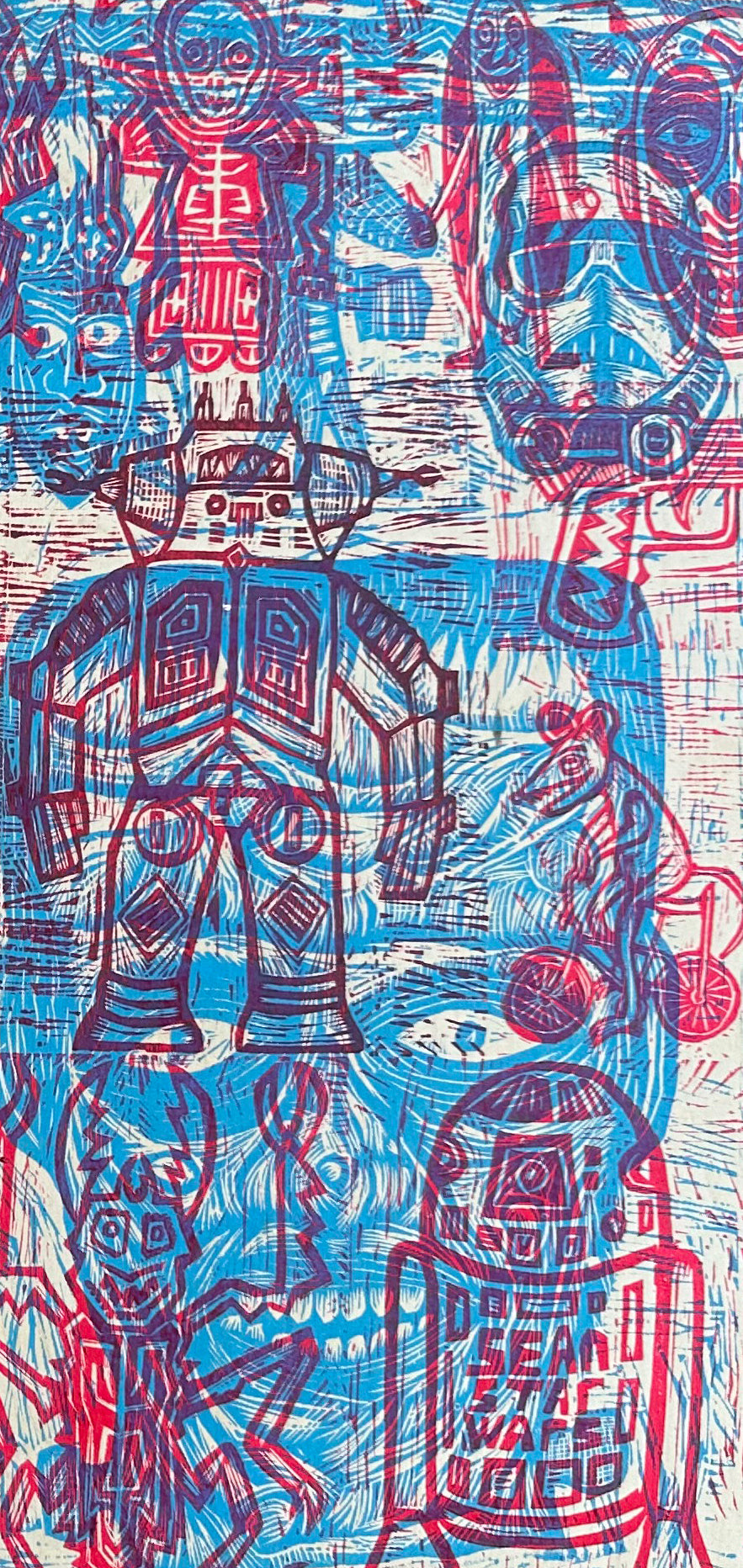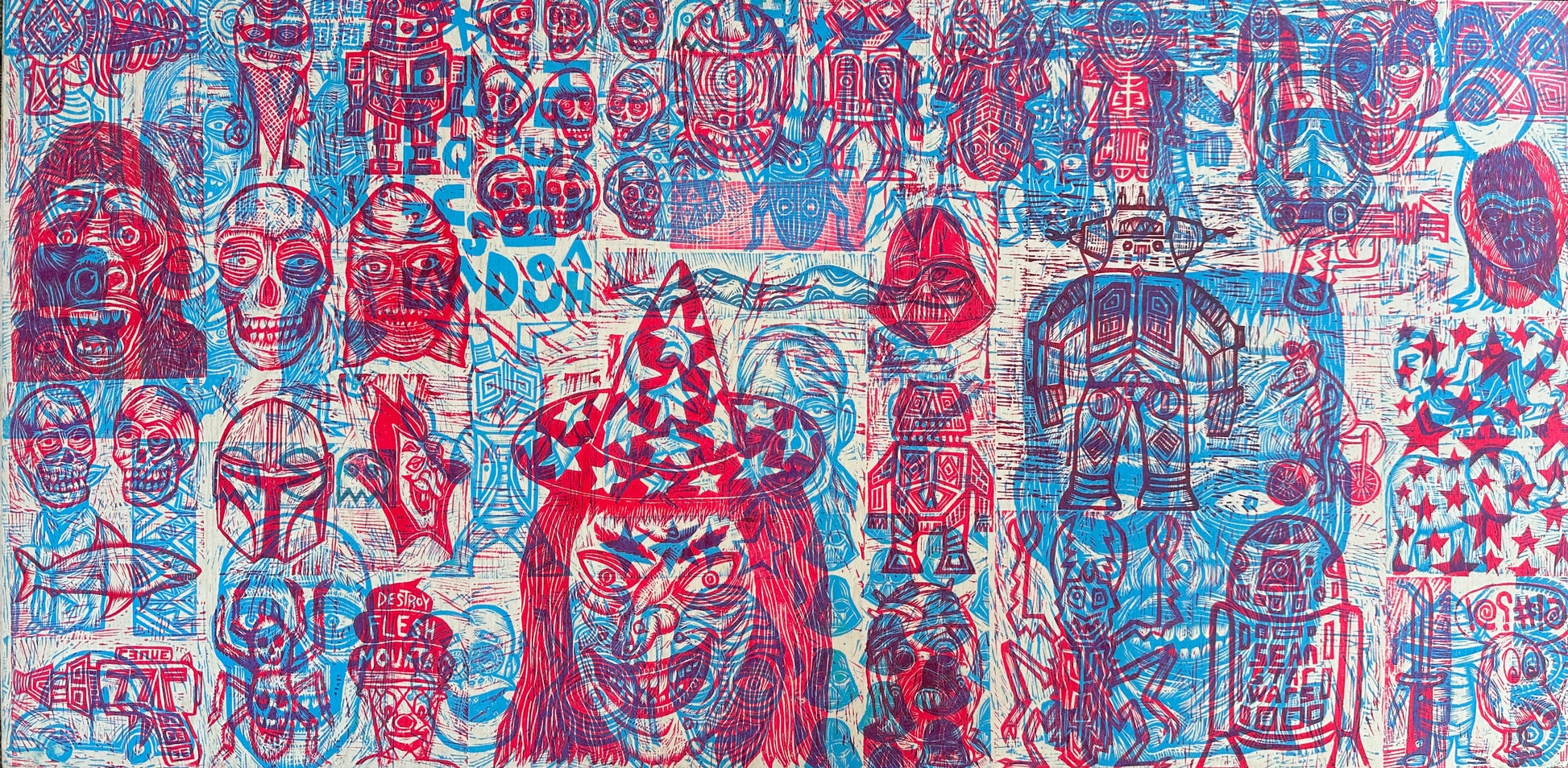 Multiple Red and Blue Woodcuts printed on Baltic Birch Panel (Panel A)