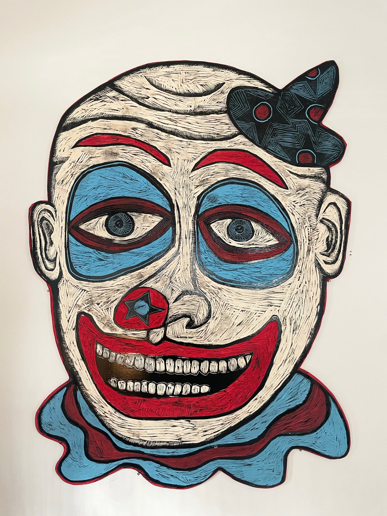 Everybody loves a Clown! Its all hand carved and shaped , painted and then black ink is rolled over the finished piece. These are a little more expensive than the prints and t-shirts I sell online, so you might have questions about it. Check out the video and the specs but if you have any questions please email me directly at woodcutfunhouse@gmail.com.