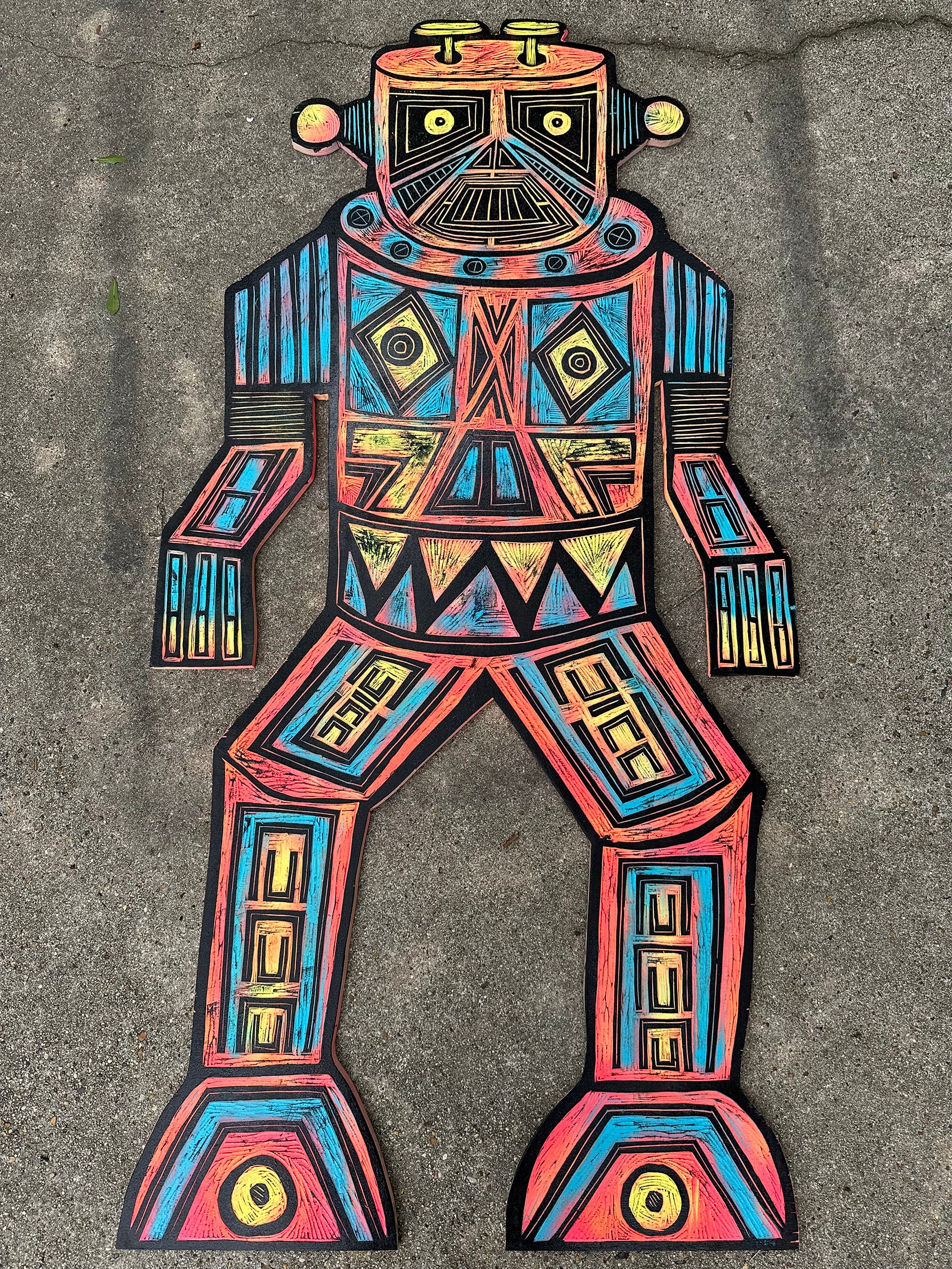 Chicken ! Fight like a Robot !! Its all hand carved and shaped , painted and then black ink is rolled over the finished piece. These are a little more expensive than the prints and t-shirts I sell online, so you might have questions about it. Check out the video and the specs but if you have any questions please email me directly at woodcutfunhouse@gmail.com.