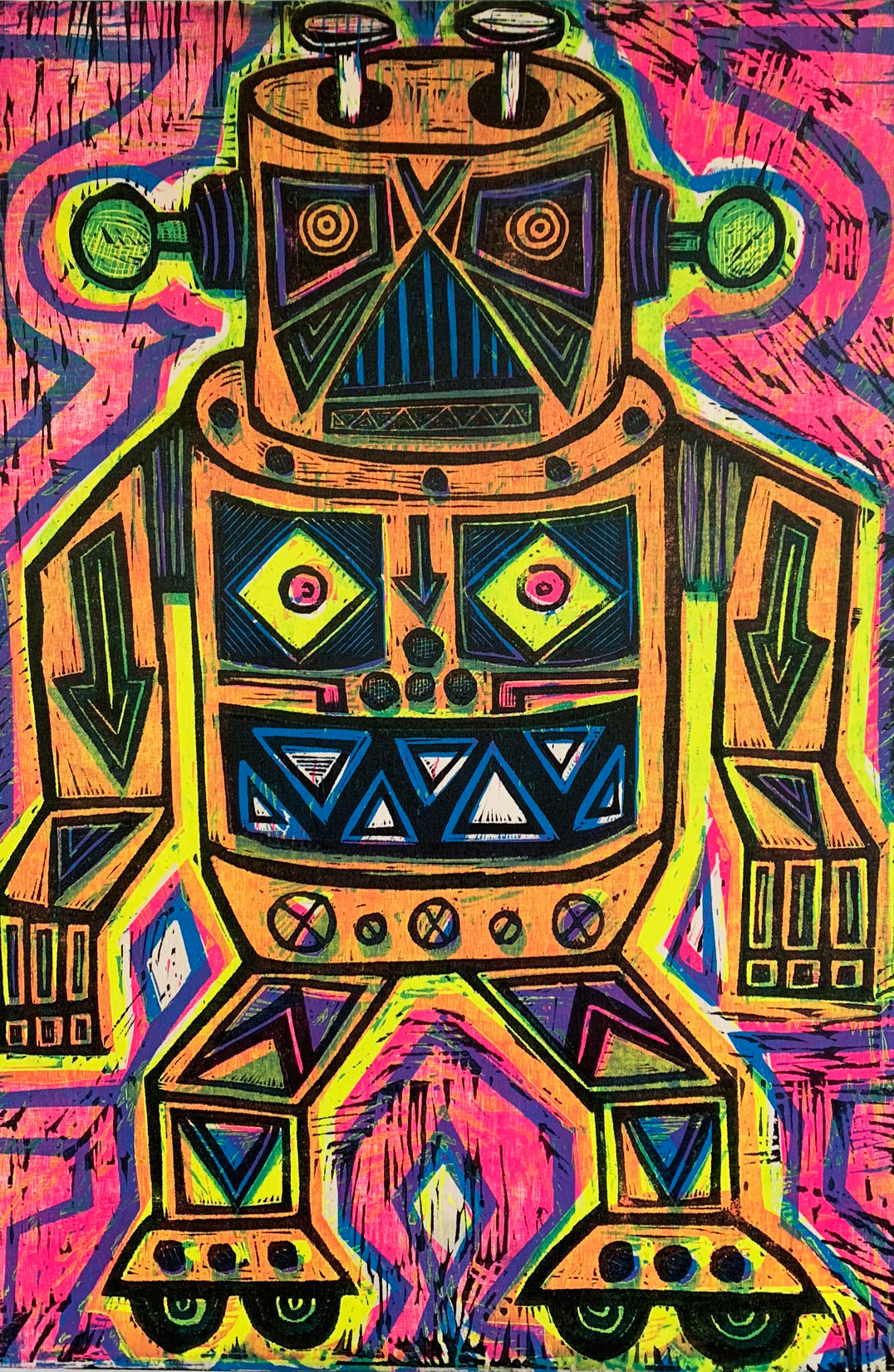 My woodcuts are carved from Russian Birch plywood using an assortment of Japanese gouges fueled by ice cold Mountain Dew