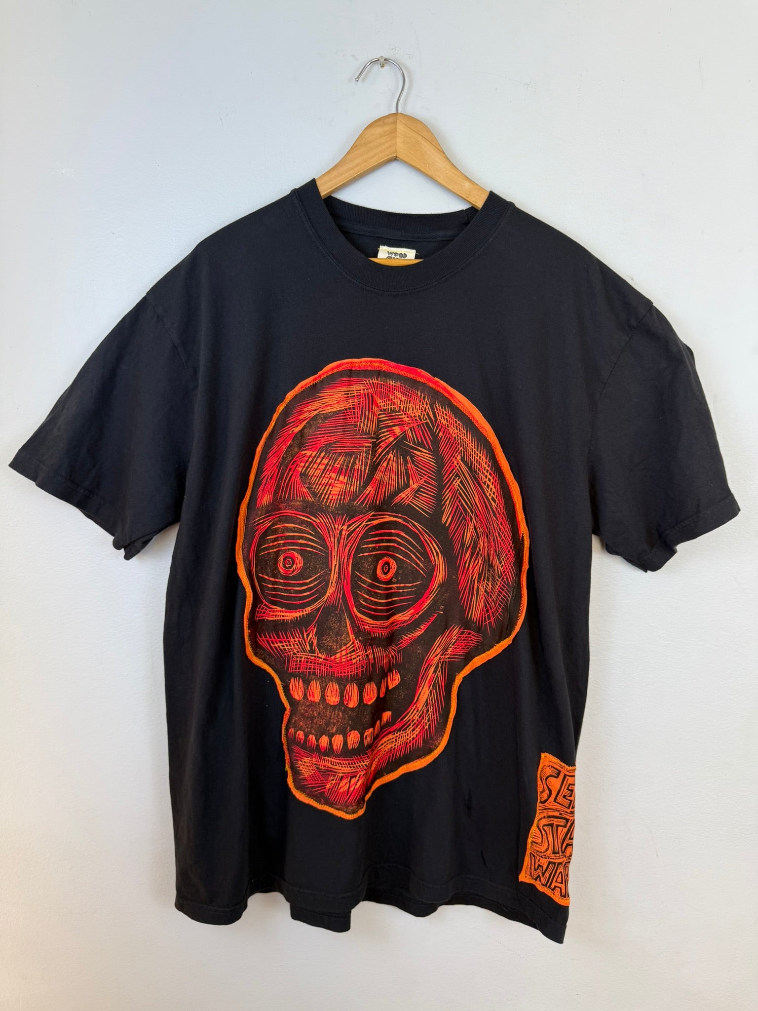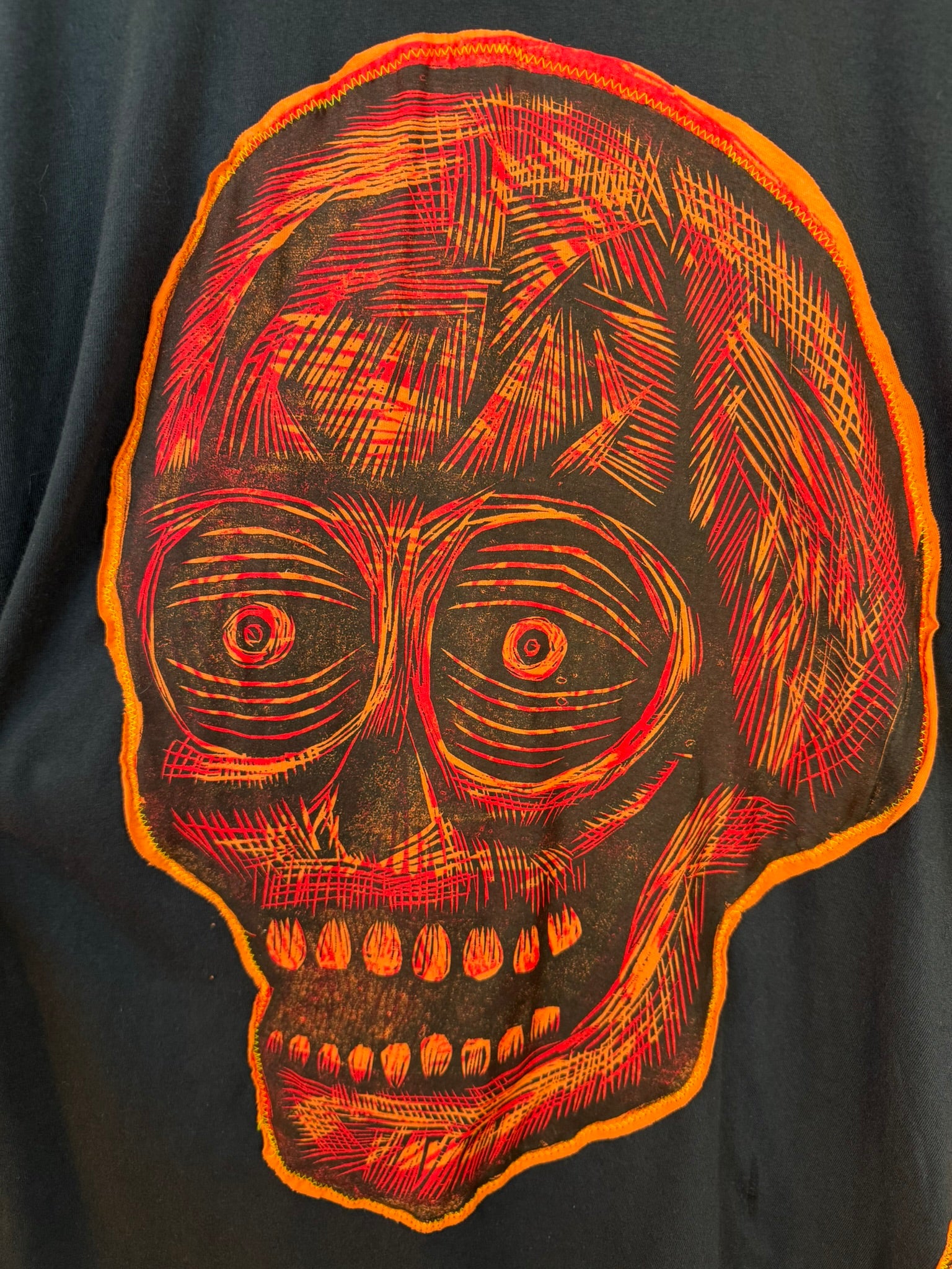Fireball Skull Appliqued Woodcut Limited Edition Handprinted T-Shirt (Limited to 50)