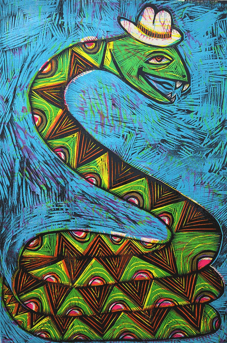 Outlaw Snake Color Handprinted Woodcut Print