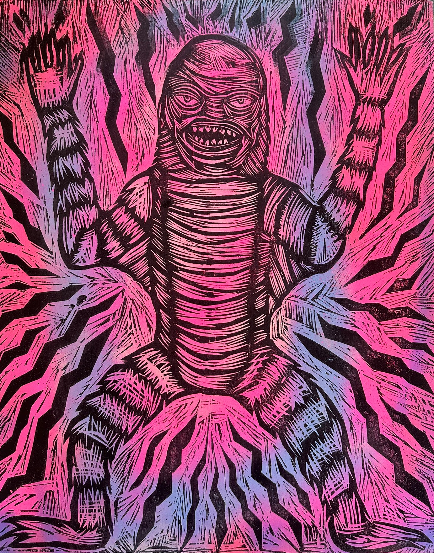 My woodcuts are carved from Russian Birch plywood using an assortment of Japanese gouges fueled by ice cold Mountain Dew