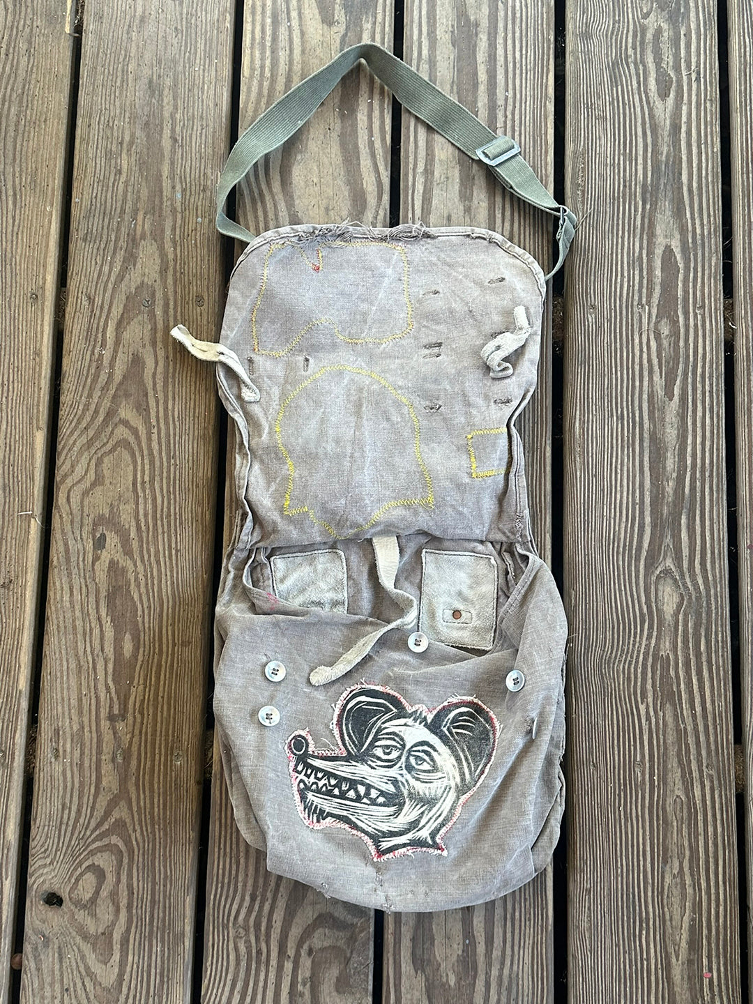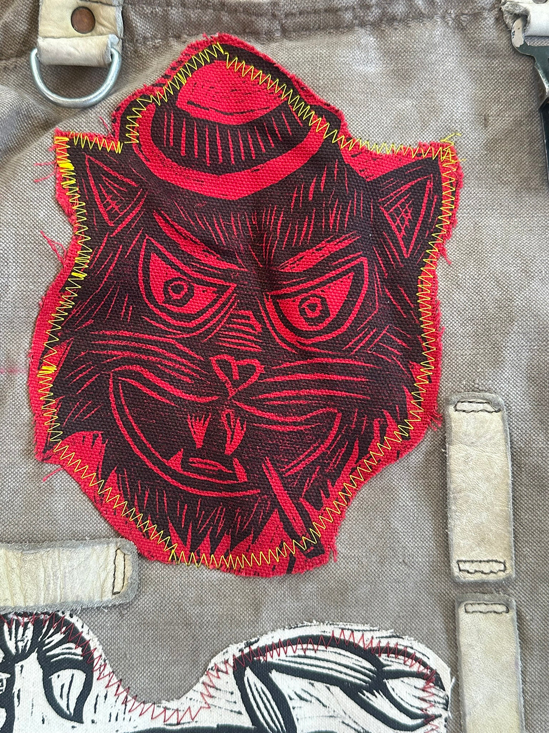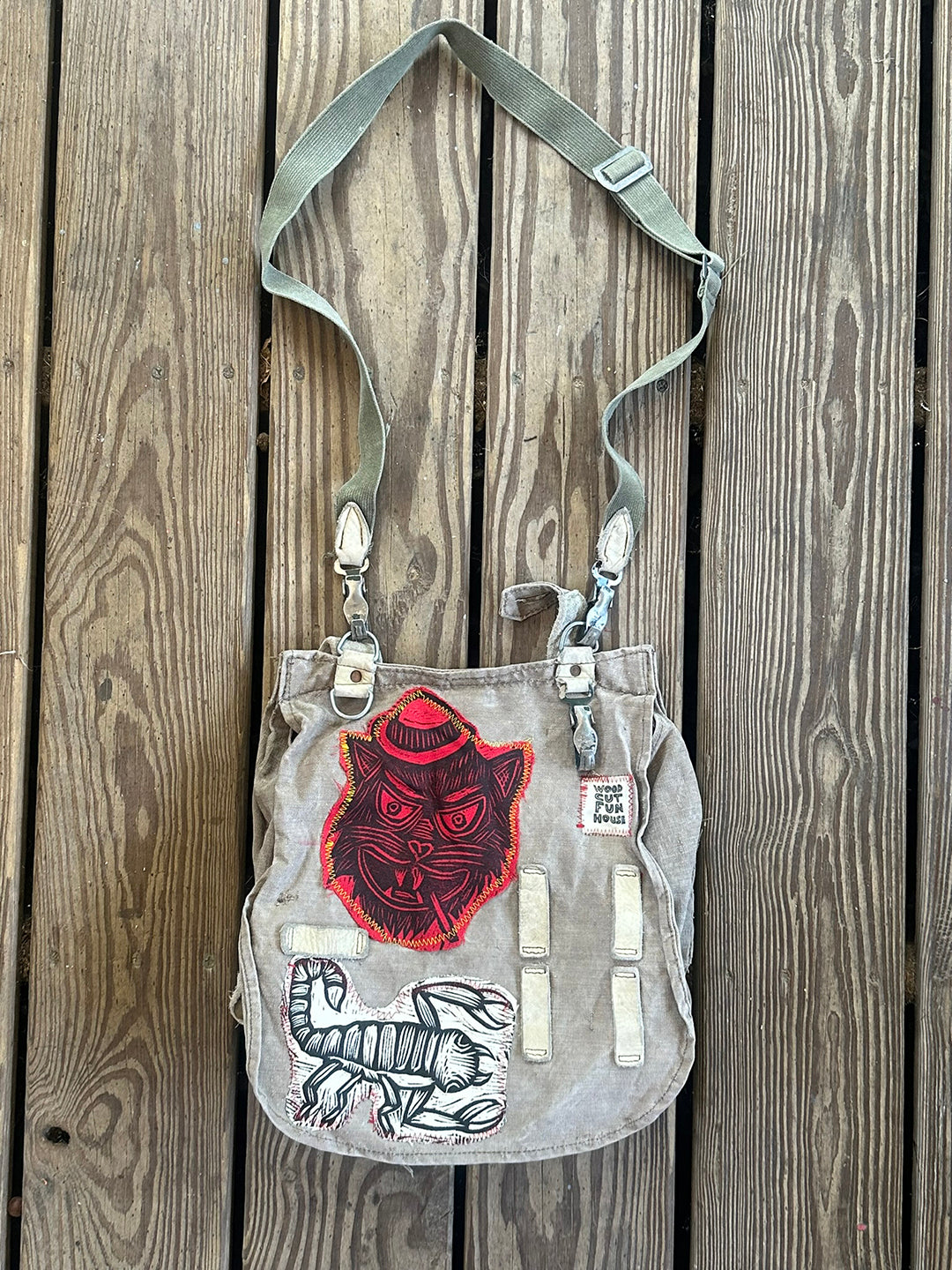 If you were from Finland during the war you might be tempted to keep your bread in this shoulder bag. But these days people from all over the world refer to these bags as rat bags. And you don't have to keep bread in there . (But you could). I personally use mine to hold my chisels while I'm working on my woodcuts... Each bag comes with the Smoking Cat, Scorpion and Rat Appliques as well as the Woodcut Funhouse sewn in label.... please note that the woodcut imagery for the patches will always be what is shown , the colors of the applique may vary .