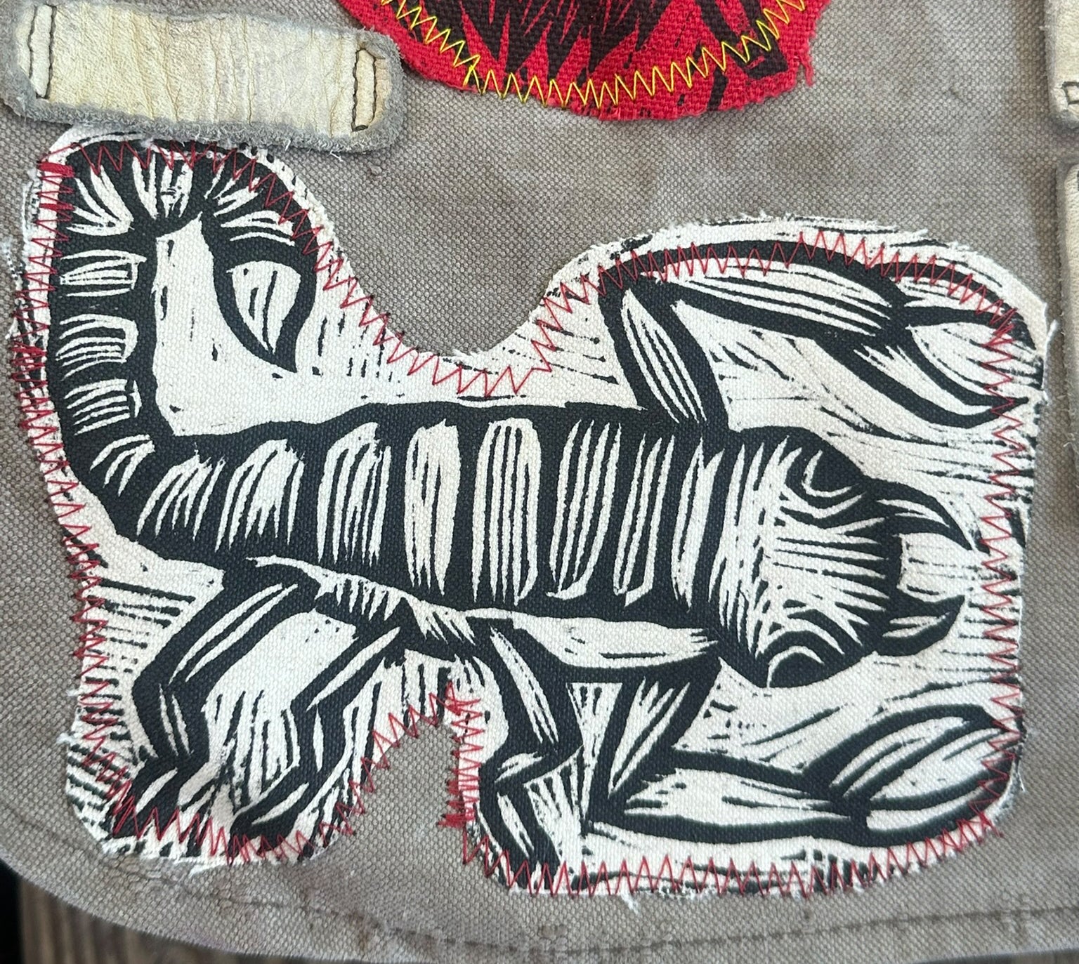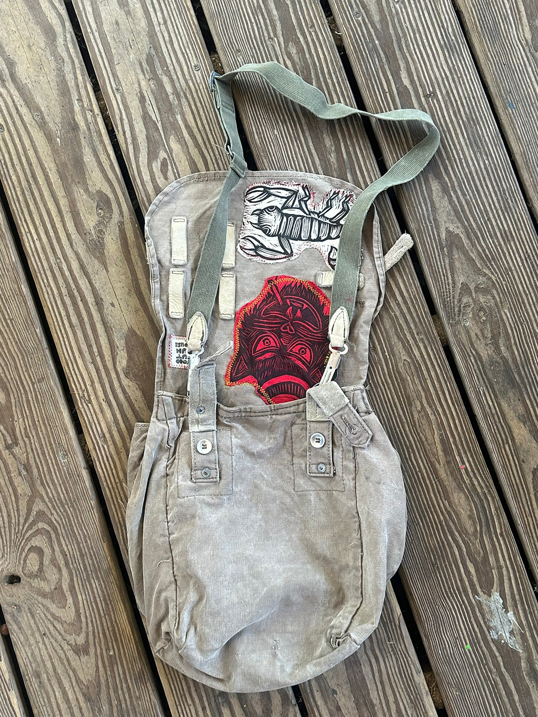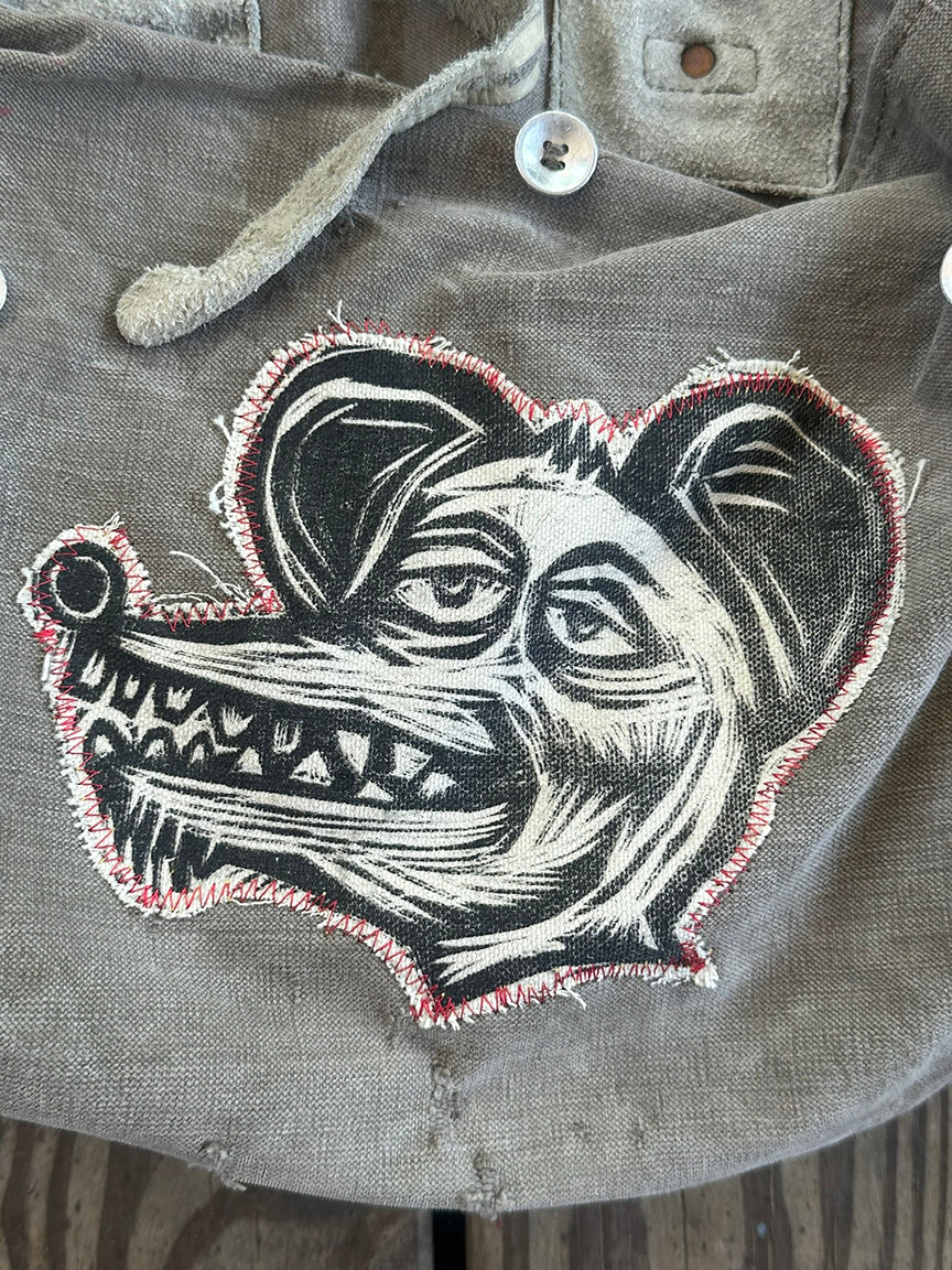 If you were from Finland during the war you might be tempted to keep your bread in this shoulder bag. But these days people from all over the world refer to these bags as rat bags. And you don't have to keep bread in there . (But you could). I personally use mine to hold my chisels while I'm working on my woodcuts... Each bag comes with the Smoking Cat, Scorpion and Rat Appliques as well as the Woodcut Funhouse sewn in label.... please note that the woodcut imagery for the patches will always be what is shown , the colors of the applique may vary .