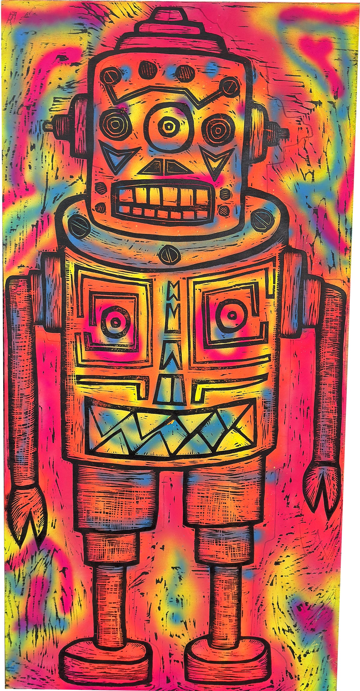 Sentinel (Orange)Woodcut handprinted on Painted Wooden Panel
