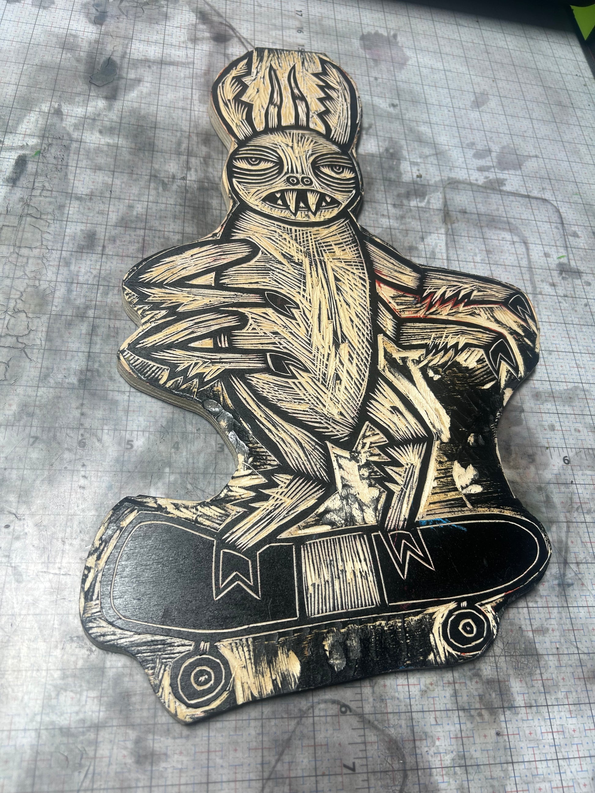 ⩙ My woodcuts are carved from Baltic Birch or Japanese Shina using an assortment of Japanese gouges printed on American-made presses, fueled by ice-cold Mountain Dew with Guided by Voices always playing loudly in the background!