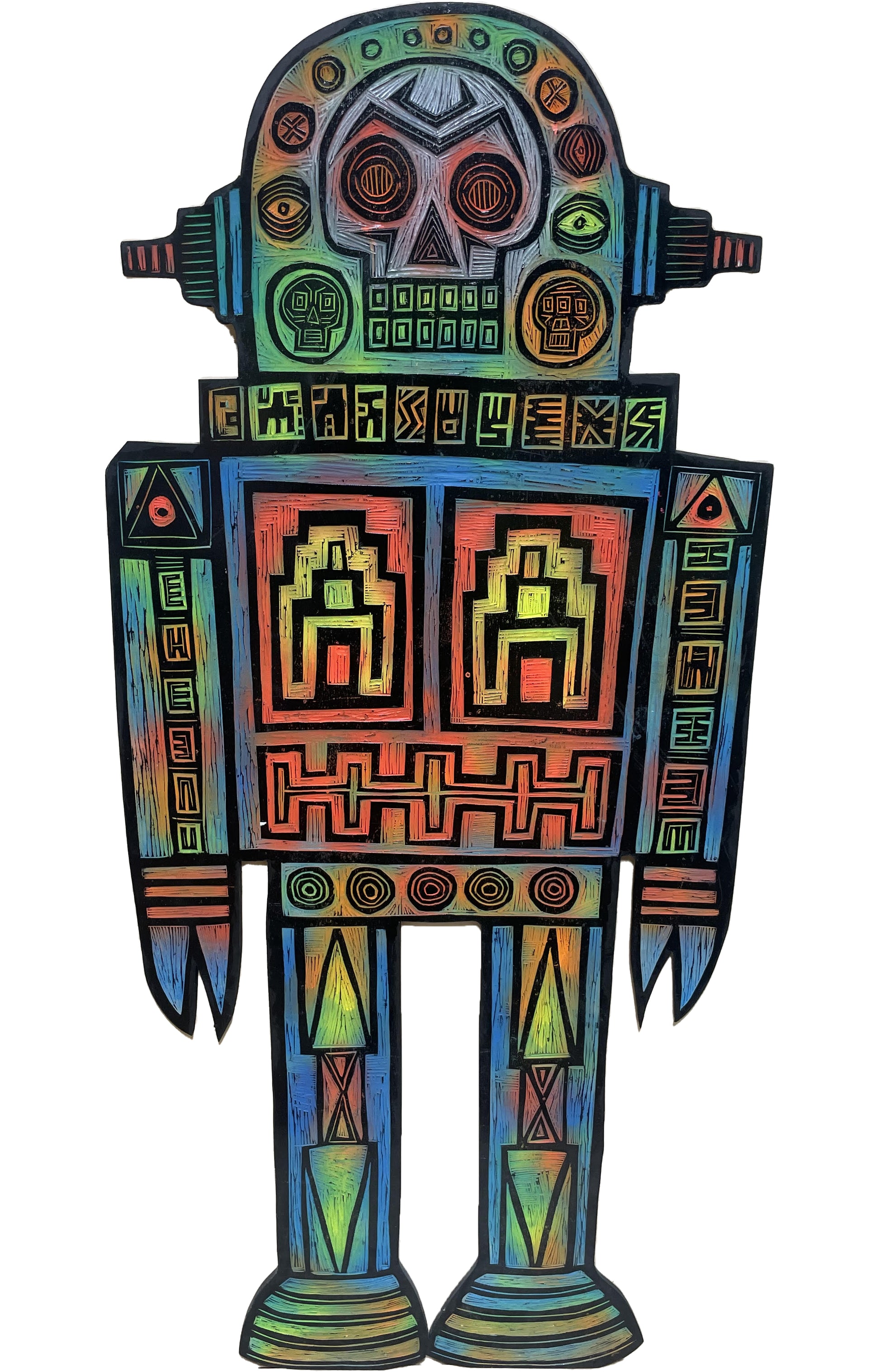 Chicken ! Fight like a Robot !! Its all hand carved and shaped , painted and then black ink is rolled over the finished piece. These are a little more expensive than the prints and t-shirts I sell online, so you might have questions about it. Check out the video and the specs but if you have any questions please email me directly at woodcutfunhouse@gmail.com.