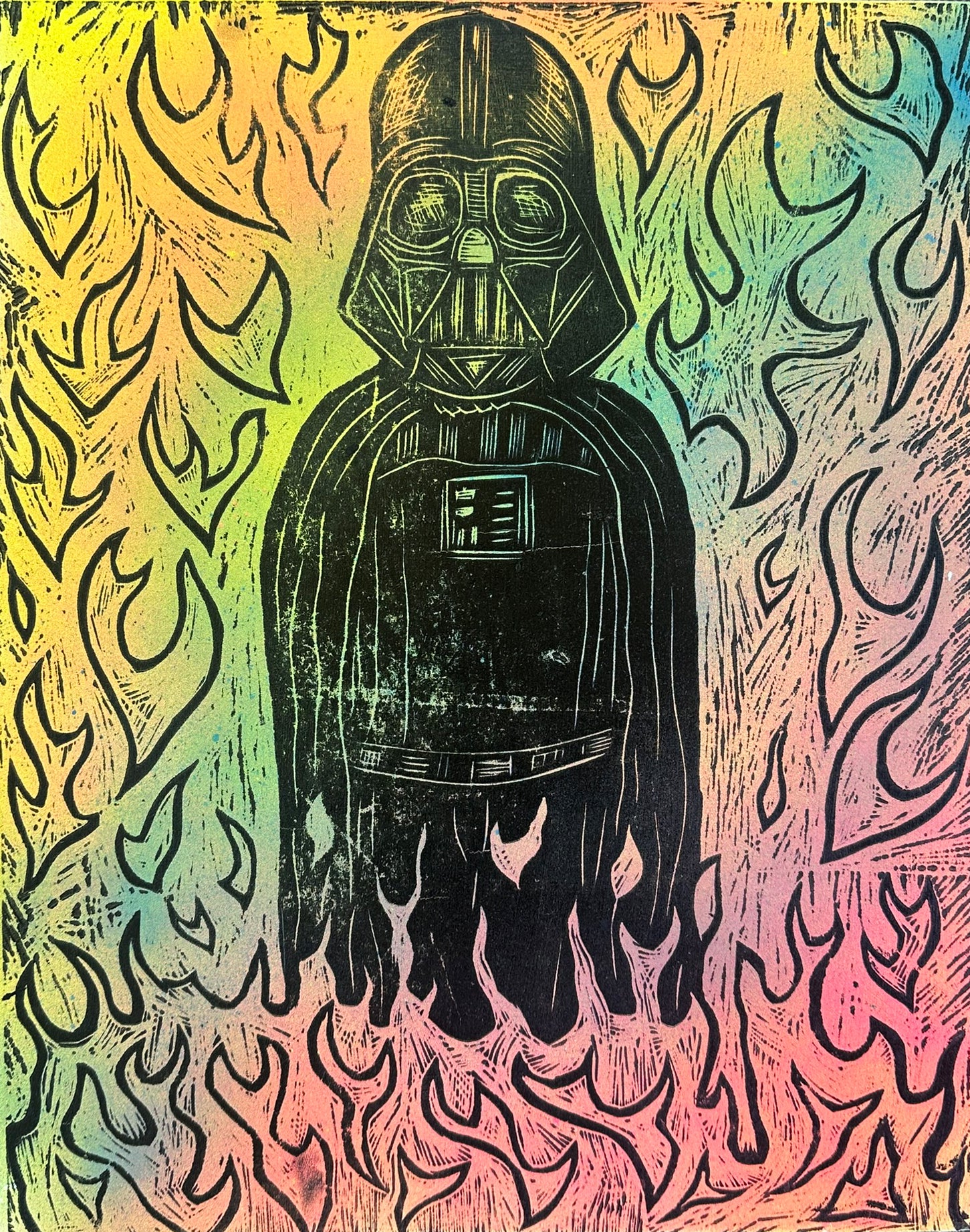 My woodcuts are carved from Russian Birch plywood using an assortment of Japanese gouges fueled by ice cold Mountain Dew