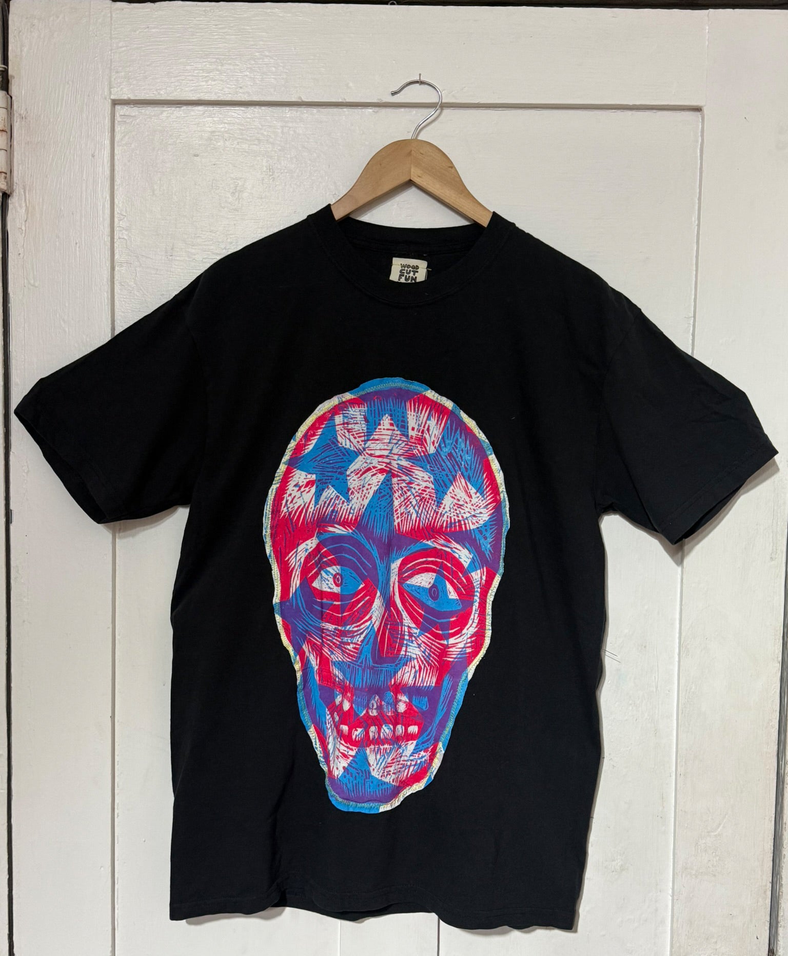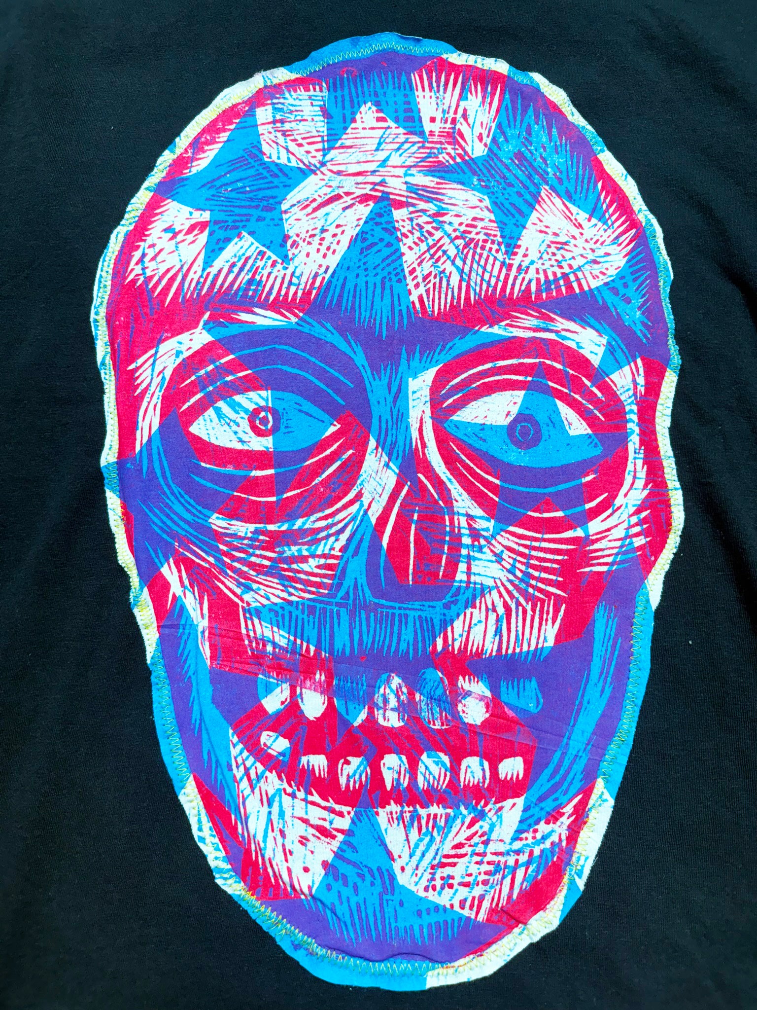 Star Skull Appliqued Woodcut Handprinted T-Shirt