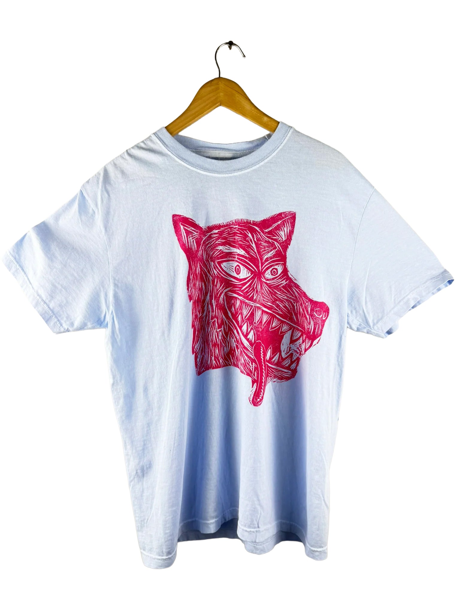 These shirts are handprinted from my woodblocks onto a light blue 100% cotton Comfort Colors T-Shirt.