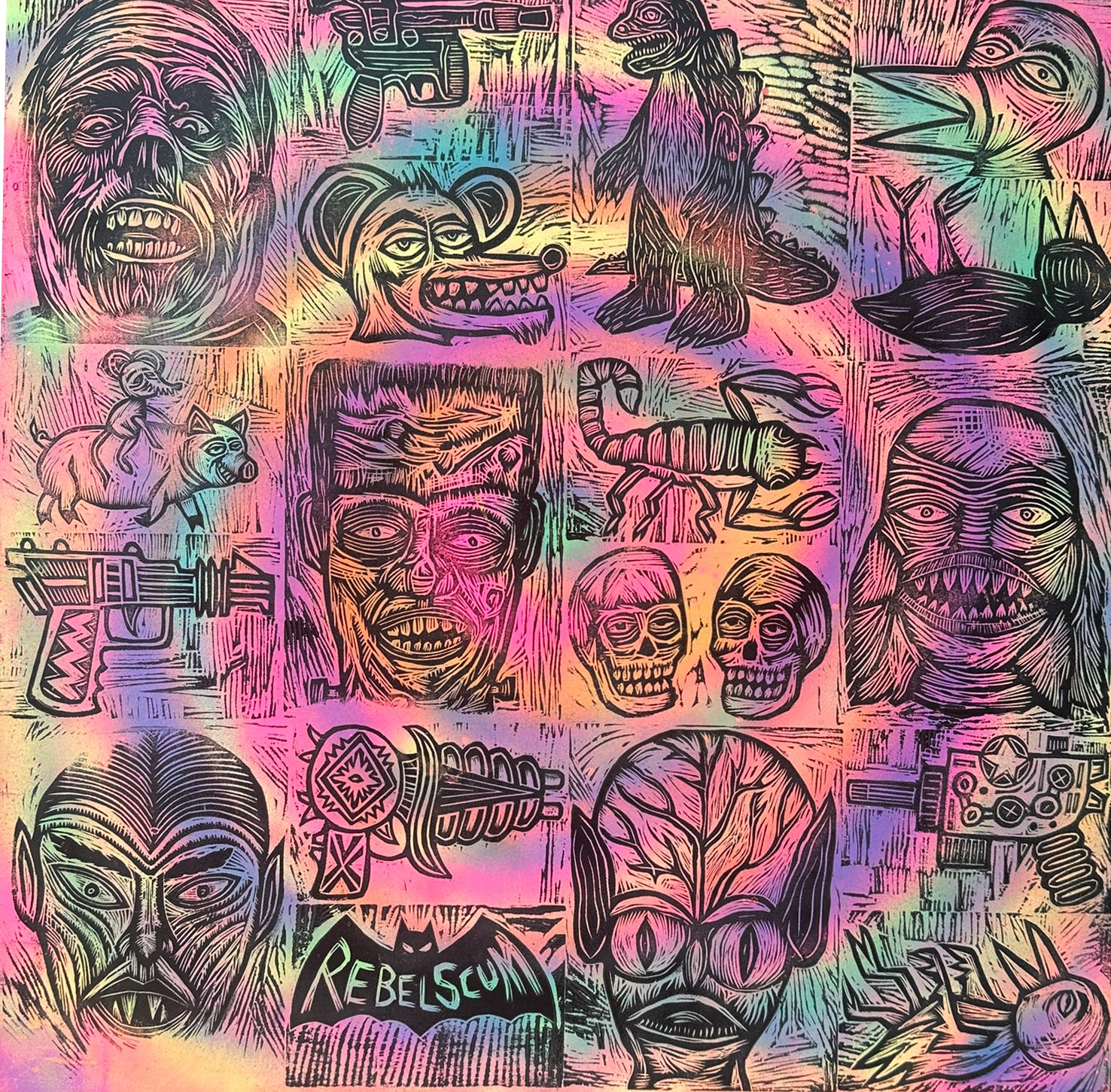 My woodcuts are carved from Russian Birch plywood using an assortment of Japanese gouges fueled by ice cold Mountain Dew