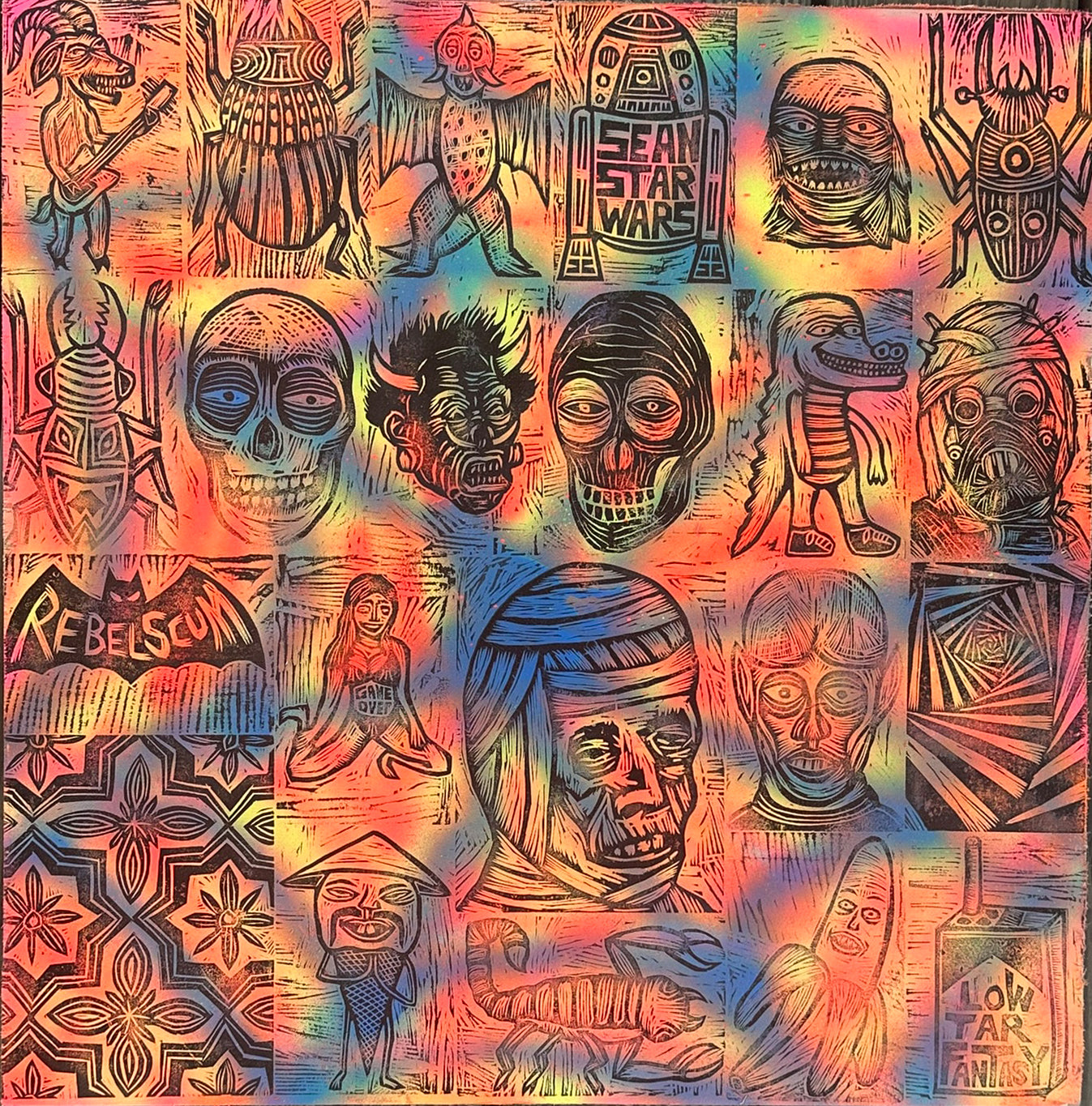 The Mummy Never Moved... Woodcuts printed on Painted Wooden Panel