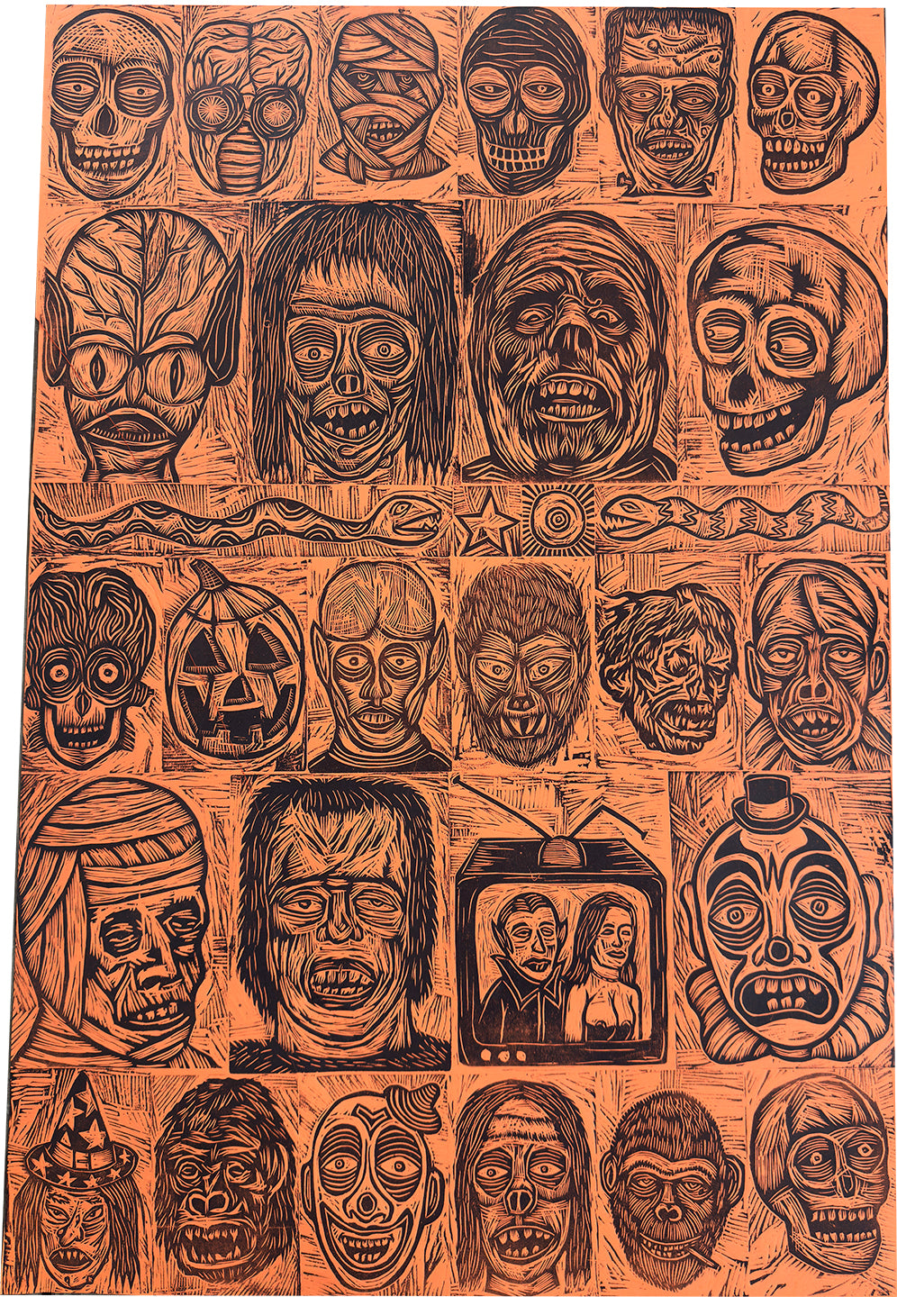 This is a Halloween themed woodcut I just added to the Shop! It features over 25 of my assorted woodcuts all arranged for maximum impact! see for yourself!