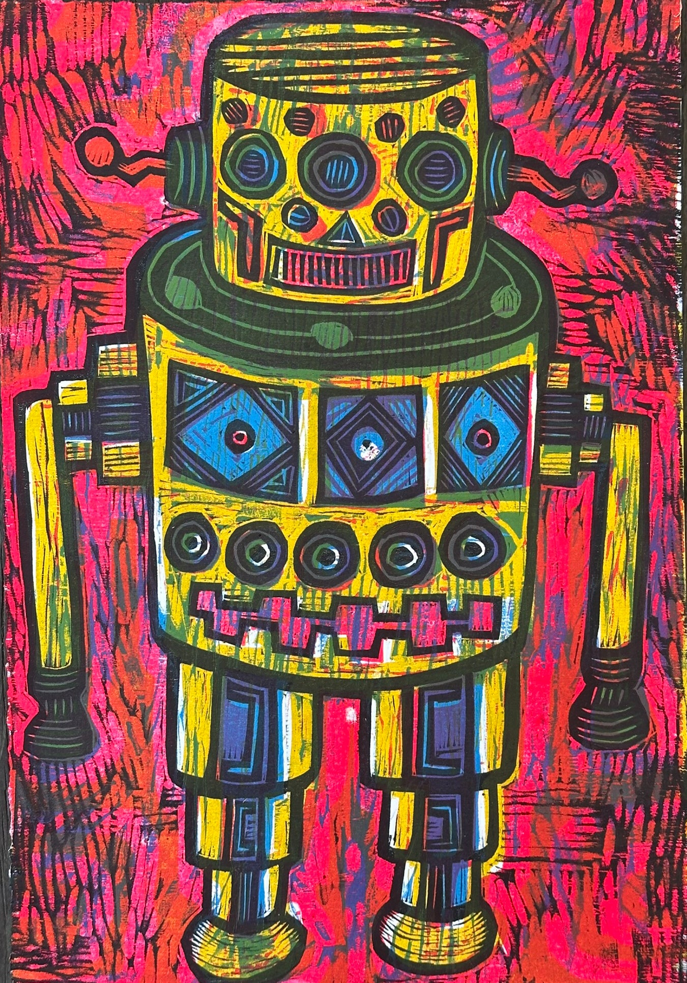 ⩙ My woodcuts are carved from Baltic Birch or Japanese Shina using an assortment of Japanese gouges printed on American-made presses, fueled by ice-cold Mountain Dew with Guided by Voices always playing loudly in the background!